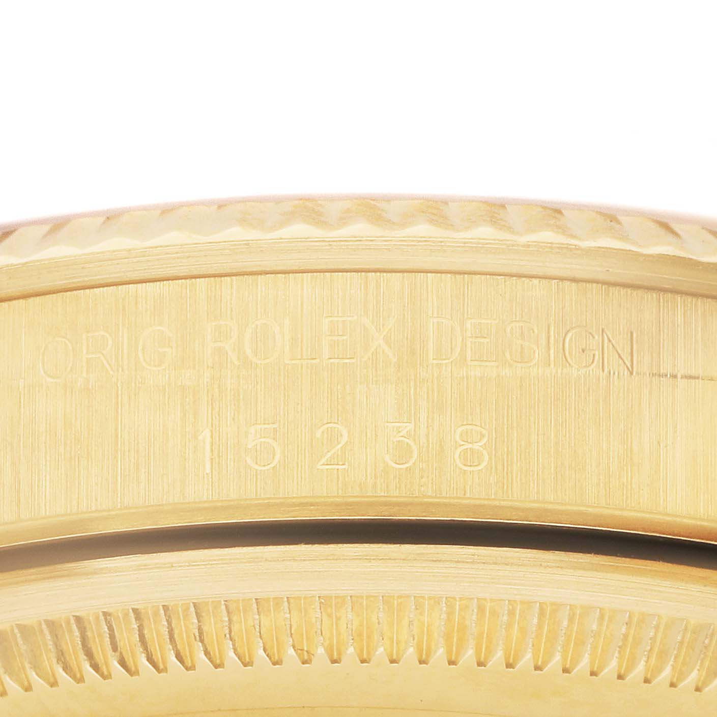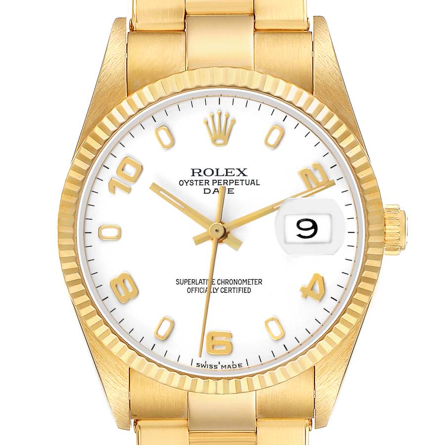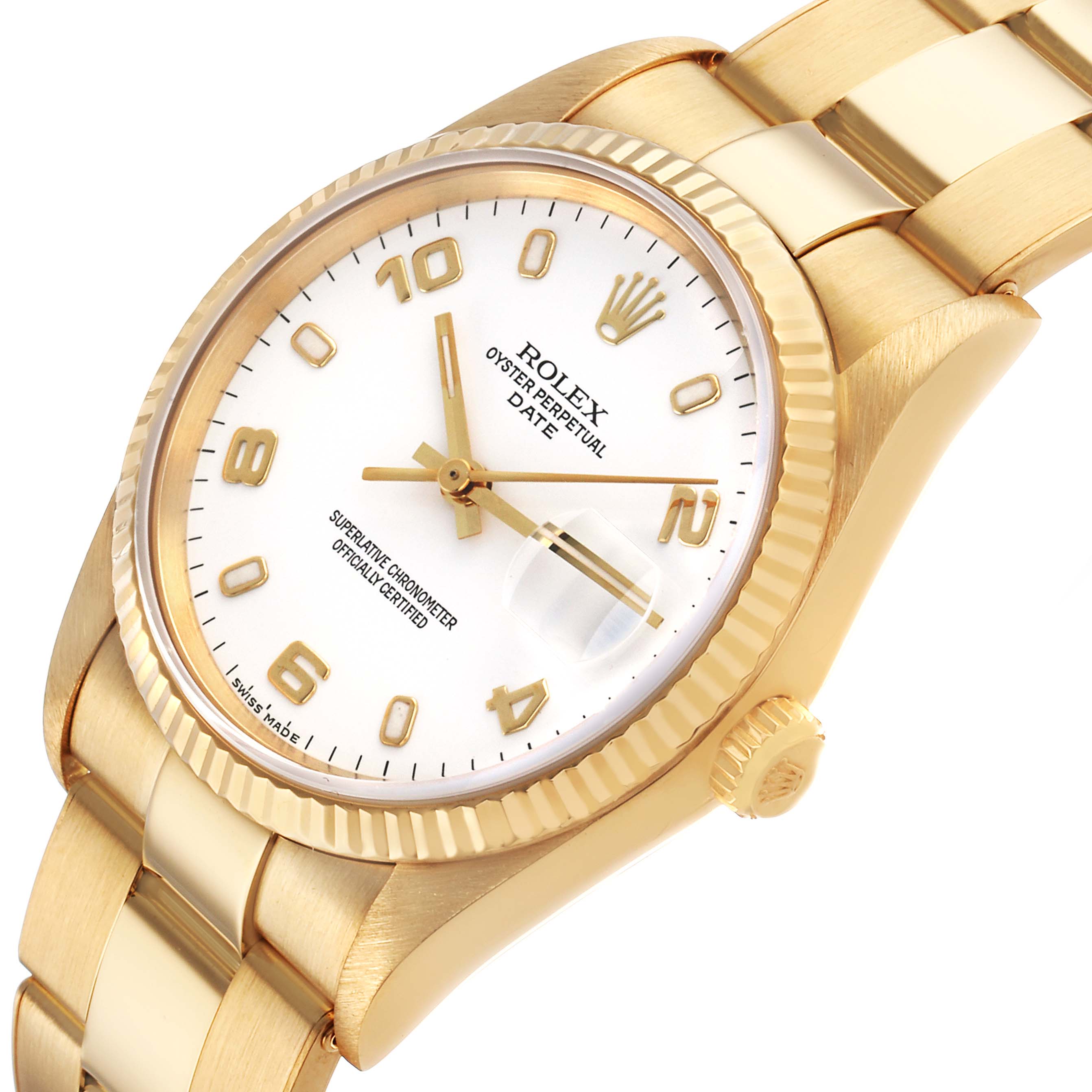 Rolex Date White Dial Yellow Gold Mens Watch 15238 Box Papers. Officially certified chronometer self-winding movement. 18k yellow gold case 34.0 mm in diameter. Rolex logo on a yellow gold crown. 18k yellow gold fluted bezel. Scratch resistant sapphire crystal with cyclops magnifier. White dial with arabic numeral and index hour markers. Yellow gold baton hands. Date window at 3 o'clock aperture. 18k yellow gold oyster bracelet with a fold-over clasp. Fits an 7 3/4'' wrist.