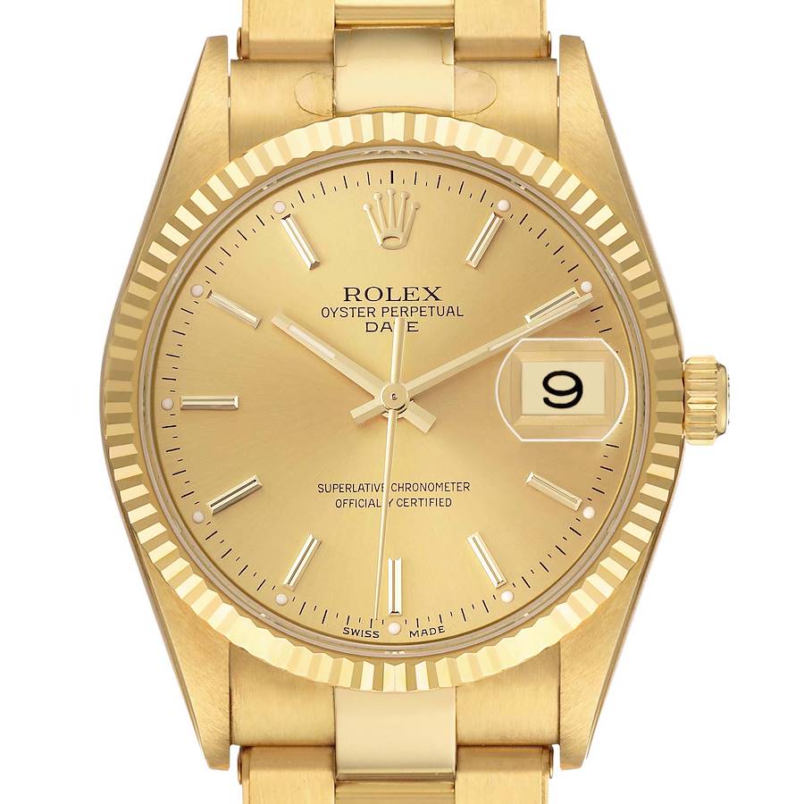 Rolex Date Yellow Gold Oyster Bracelet Mens Watch 15238 Box Papers. Officially certified chronometer self-winding movement. 18k yellow gold case 34.0 mm in diameter. Rolex logo on a crown. 18k yellow gold fluted bezel. Scratch resistant sapphire crystal with cyclops magnifier. Champagne dial with raised gold index hour markers. Date window at 3 o'clock aperture. 18k yellow gold oyster bracelet with fold over clasp.