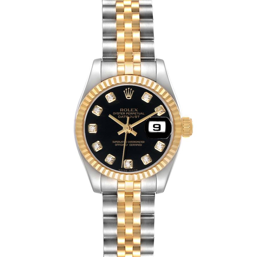 Rolex Datejust 26 Black Diamond Dial Steel Yellow Gold Ladies Watch 179173. Officially certified chronometer automatic self-winding movement. Stainless steel oyster case 26.0 mm in diameter. Rolex logo on the 18K yellow gold crown. 18k yellow gold fluted bezel. Scratch resistant sapphire crystal with cyclops magnifier. Black dial with original Rolex factory diamond hour markers and yellow gold baton hands. Date calendar at the 3 o'clock aperture. Stainless steel and 18k yellow gold jubilee bracelet with a hidden clasp. Fits a 6 1/4" wrist.