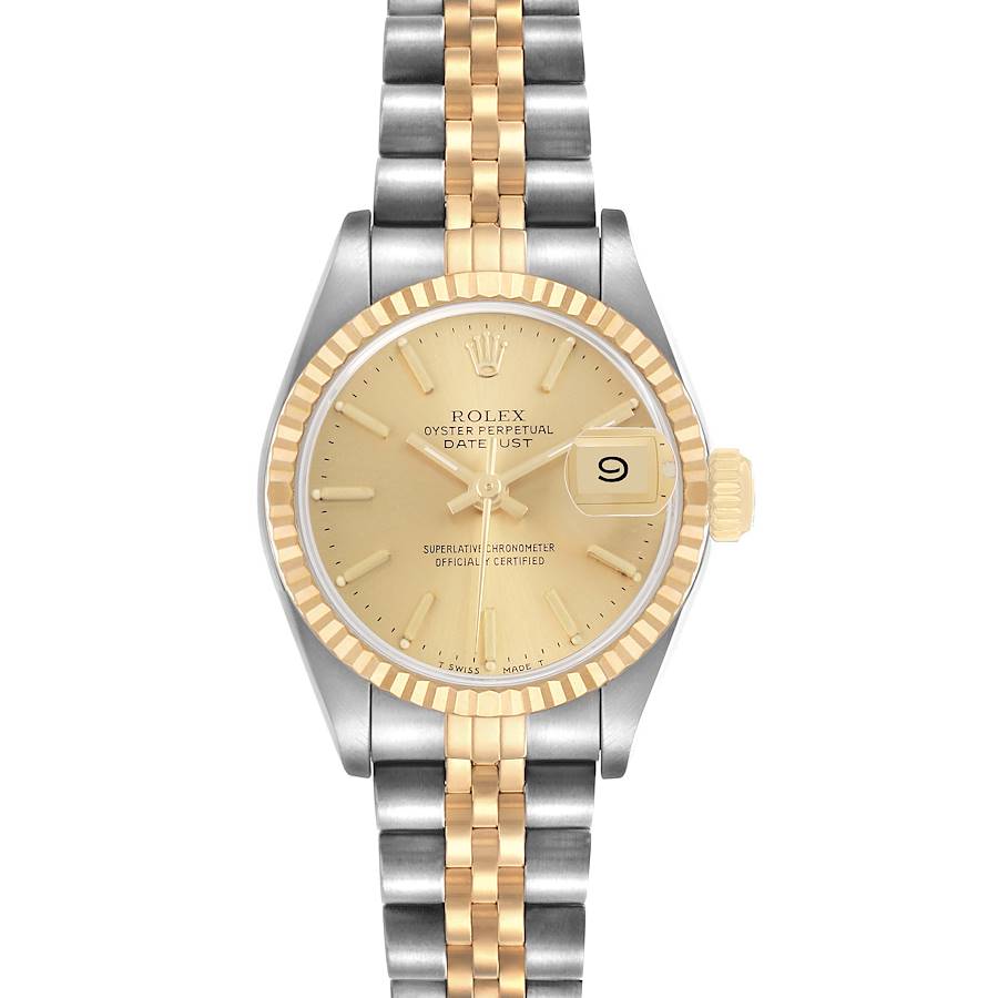 Rolex Datejust 26 Champagne Dial Steel Yellow Gold Ladies Watch 69173. Officially certified chronometer automatic self-winding movement. Stainless steel oyster case 26.0 mm in diameter. Rolex logo on the 18k yellow gold crown. 18k yellow gold fluted bezel. Scratch resistant sapphire crystal with a cyclops magnifier. Champagne dial with yellow gold baton hour markers and yellow gold baton hands. Date calendar at the 3 o'clock aperture. Stainless steel and 18k yellow gold jubilee bracelet with a fold-over clasp. Fits a 6 1/4" wrist.