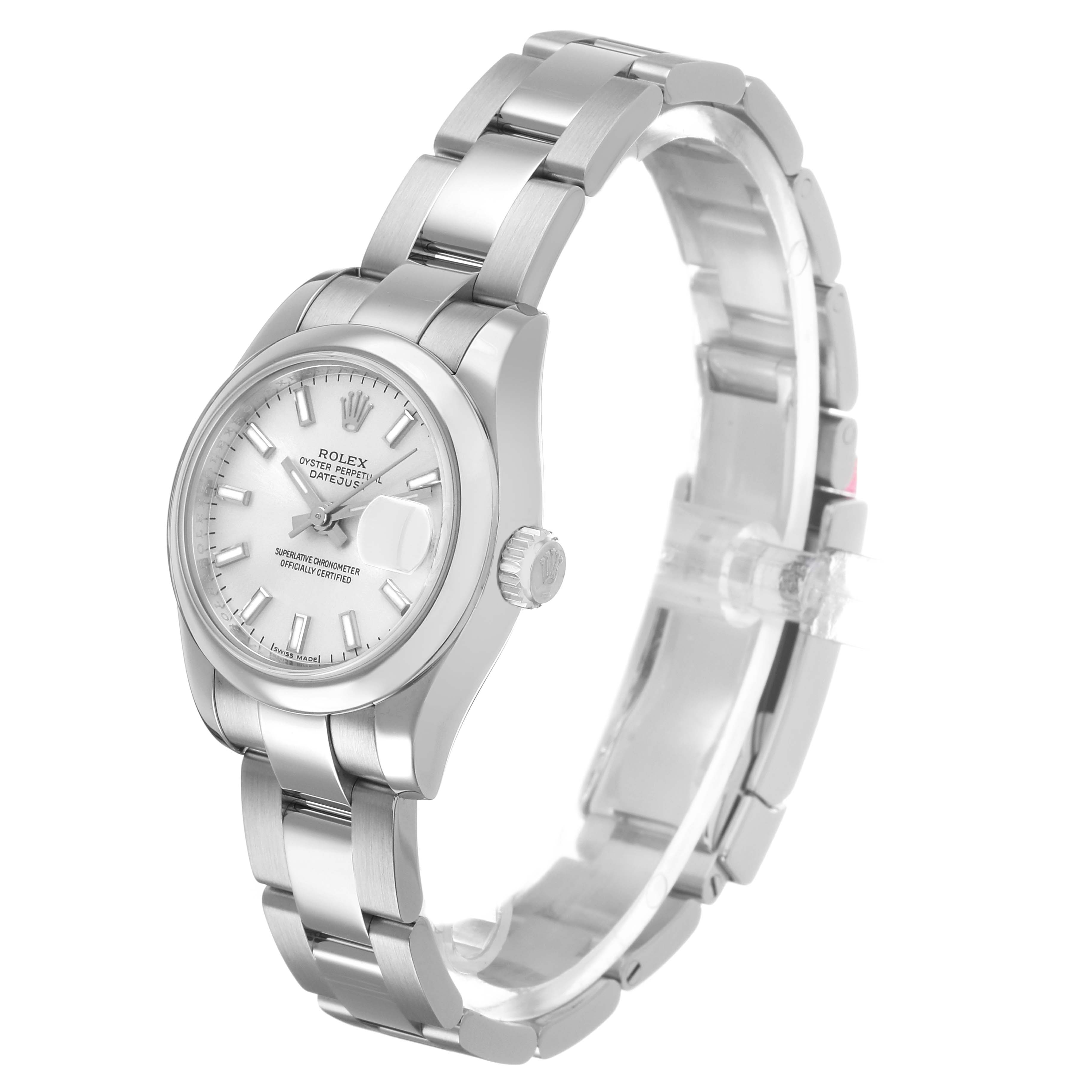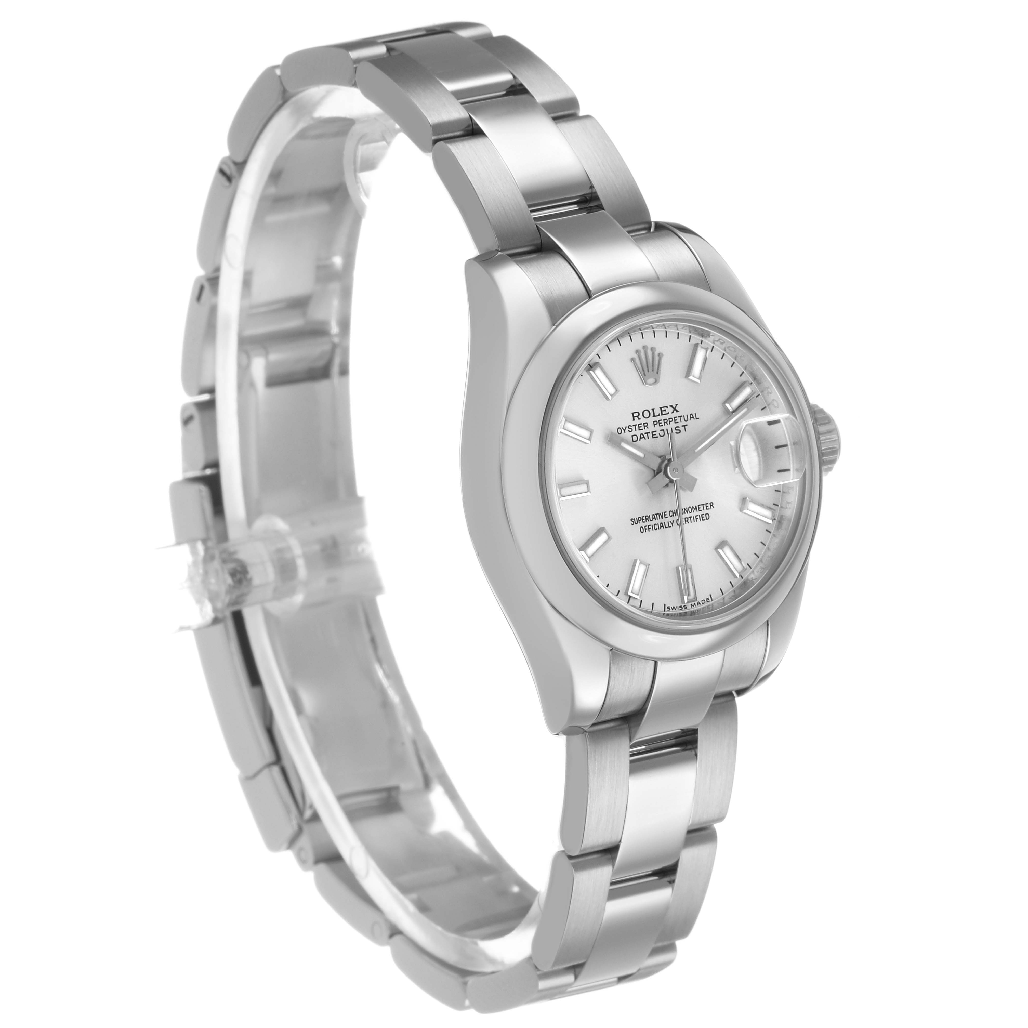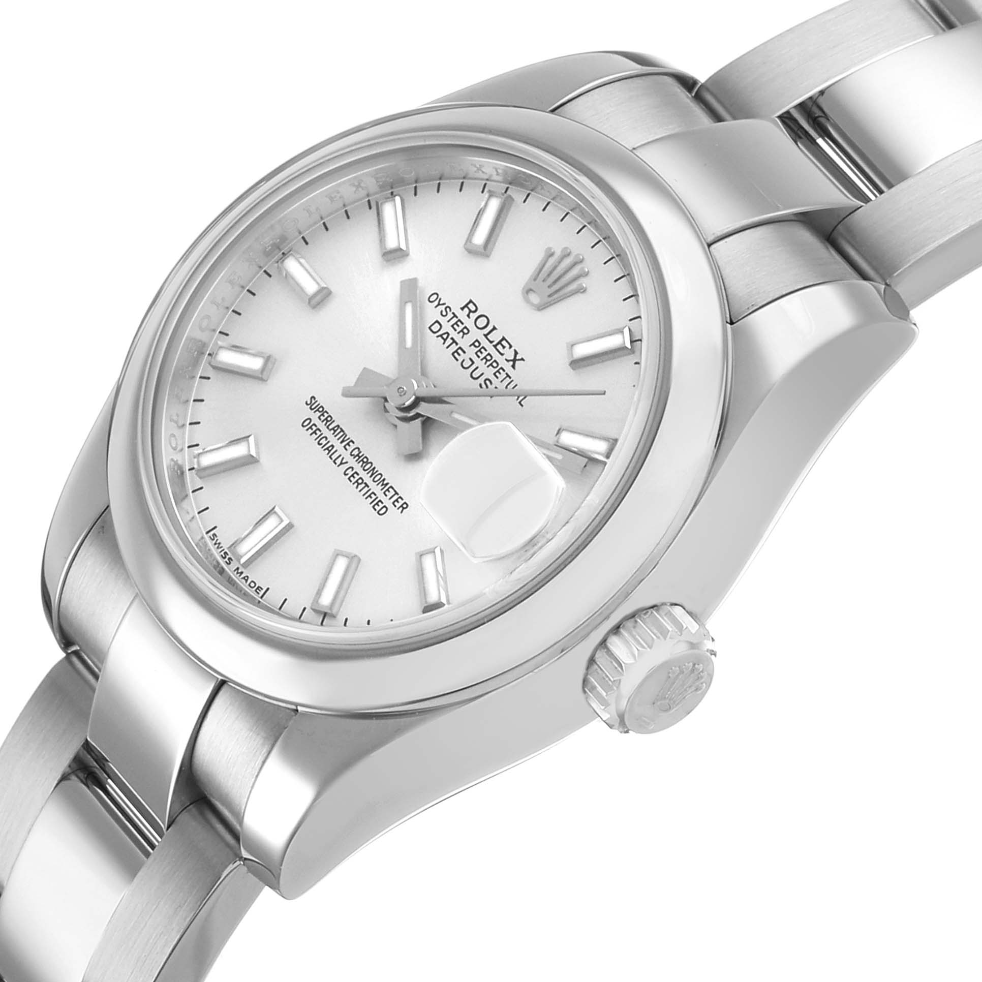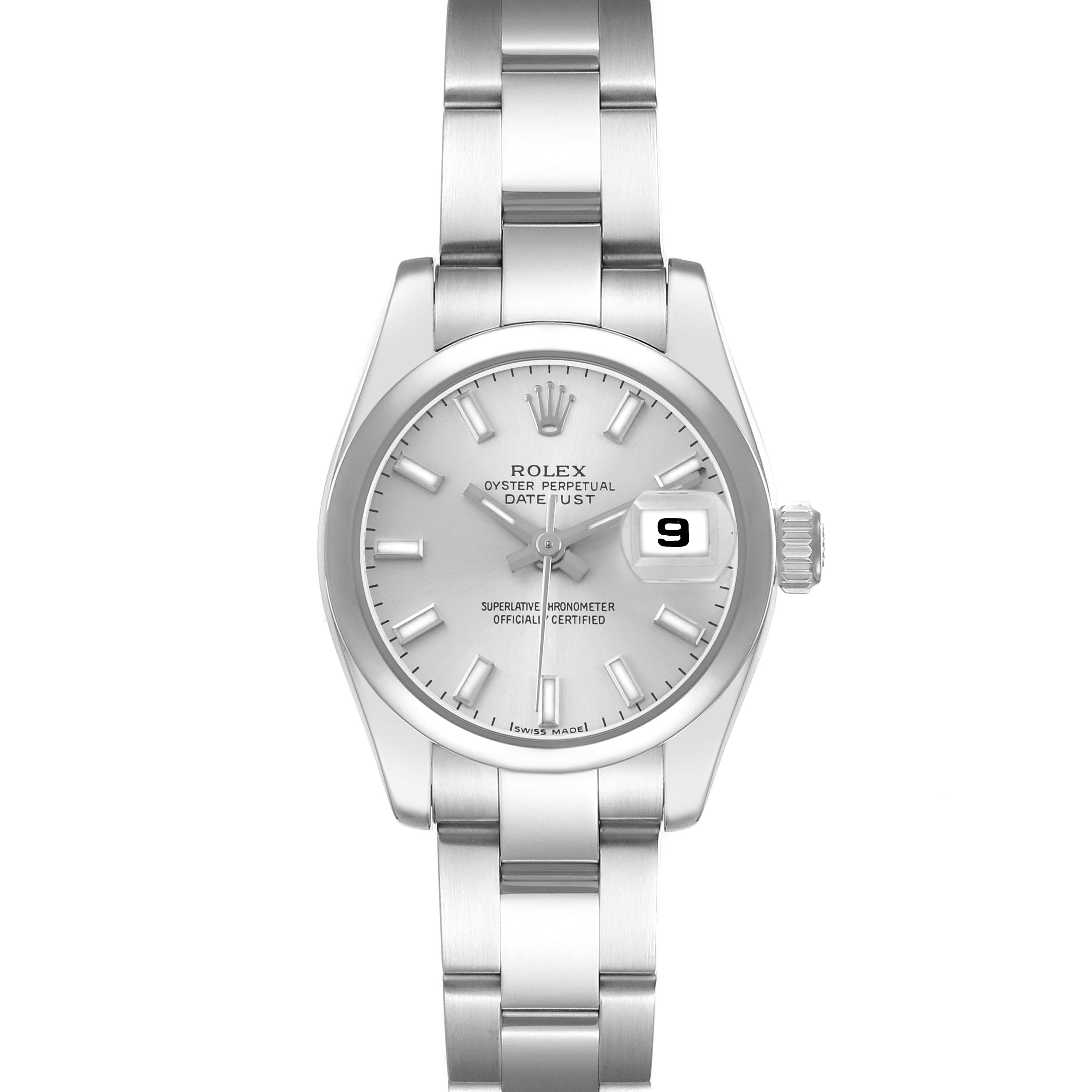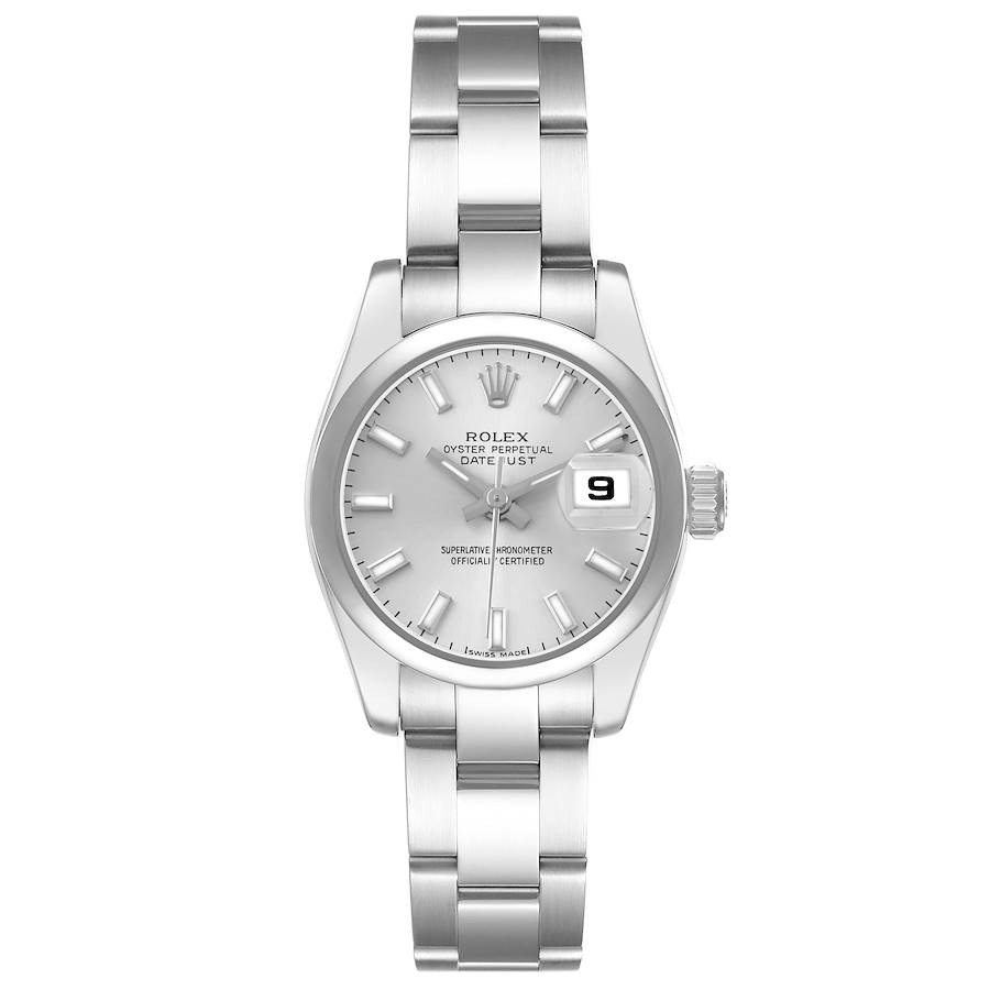 Rolex Datejust 26 Steel Silver Dial Ladies Watch 179160. Officially certified chronometer self-winding movement. Stainless steel oyster case 26 mm in diameter. Rolex logo on a crown. Stainless steel smooth bezel. Scratch resistant sapphire crystal with cyclops magnifier. Silver dial with raised luminous baton hour markers. Date calendar at 3 o'clock aperture. Stainless steel oyster bracelet with a deployent clasp. Fits a 7" wrist.