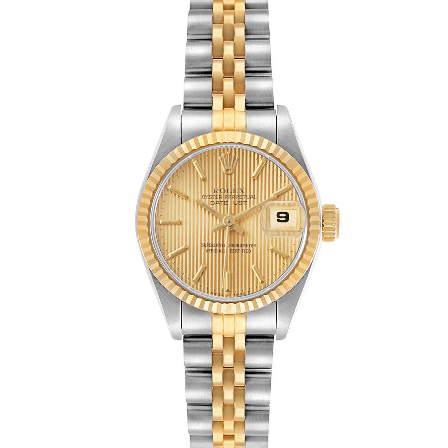 Rolex Datejust 26 Steel Yellow Gold Tapestry Dial Ladies Watch 69173. Officially certified chronometer automatic self-winding movement. Stainless steel oyster case 26.0 mm in diameter. Rolex logo on the 18k yellow gold crown. 18k yellow gold fluted bezel. Scratch-resistant sapphire crystal with a cyclops magnifier. Champagne tapestry dial with yellow gold baton hands and hour markers. Date calendar at the 3 o'clock aperture. Stainless steel and 18k yellow gold jubilee bracelet with a fold-over clasp. Fits a 6 1/4" wrist.
