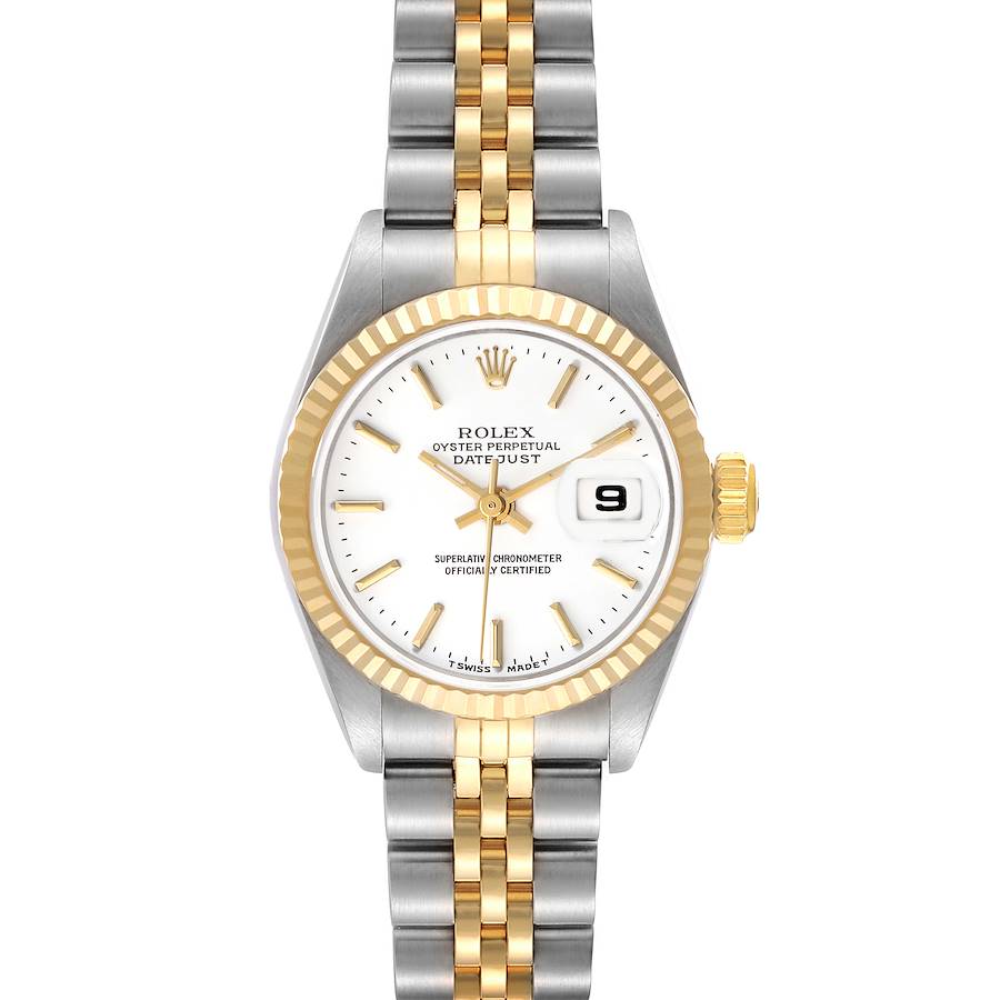Rolex Datejust 26 Steel Yellow Gold White Dial Ladies Watch 69173. Officially certified chronometer automatic self-winding movement. Stainless steel oyster case 26.0 mm in diameter. Rolex logo on the 18k yellow gold crown. 18k yellow gold fluted bezel. Scratch resistant sapphire crystal with a cyclops magnifier. White dial with yellow gold baton hour markers and yellow gold baton hands. Date calendar at the 3 o'clock aperture. Stainless steel and 18k yellow gold jubilee bracelet with a fold-over clasp. Fits a 6 1/4" wrist.