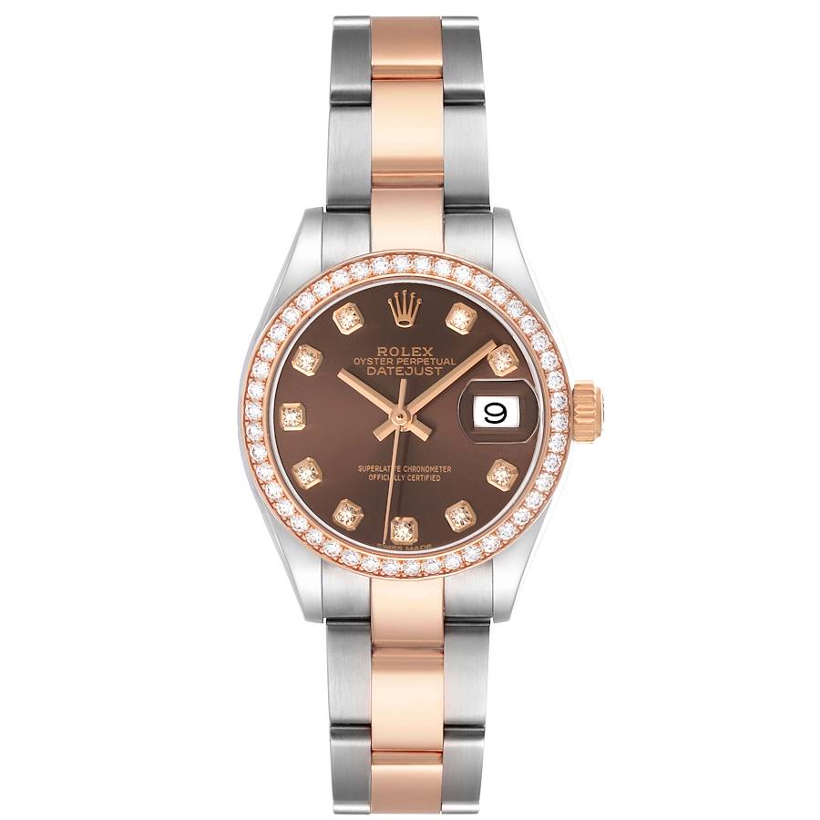 Rolex Datejust 28 Chocolate Dial Steel Rose Gold Diamond Watch 279381. Officially certified chronometer self-winding movement. Stainless steel oyster case 28.0 mm in diameter. Rolex logo on a 18K rose gold crown. 18k rose gold original Rolex factory diamond bezel. Scratch resistant sapphire crystal with cyclops magnifier. Chocolate brown dial with original Rolex factory diamond hour markers. Date calendar at 3 o'clock aperture. Stainless steel and 18k rose gold jubilee bracelet with a hidden clasp. Fits a 6.5" wrist.