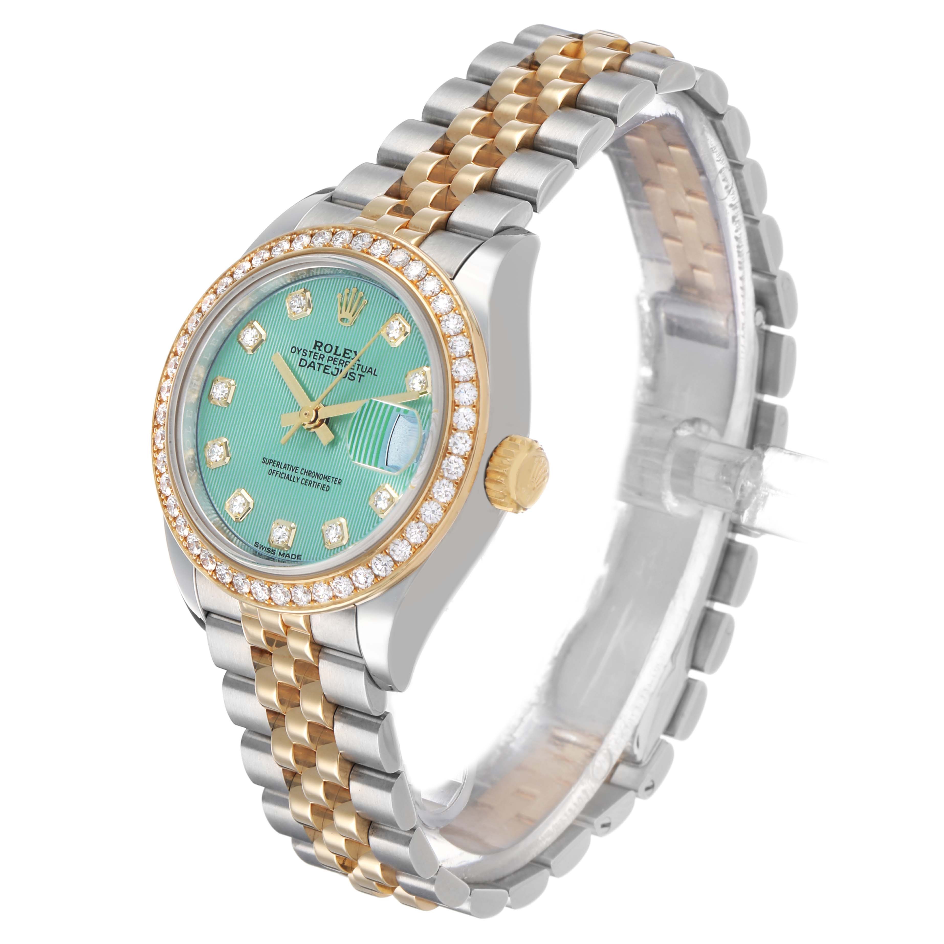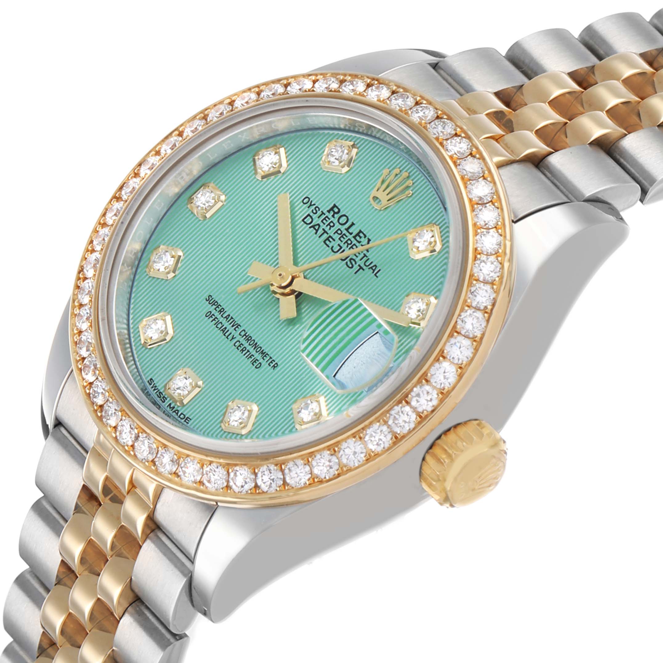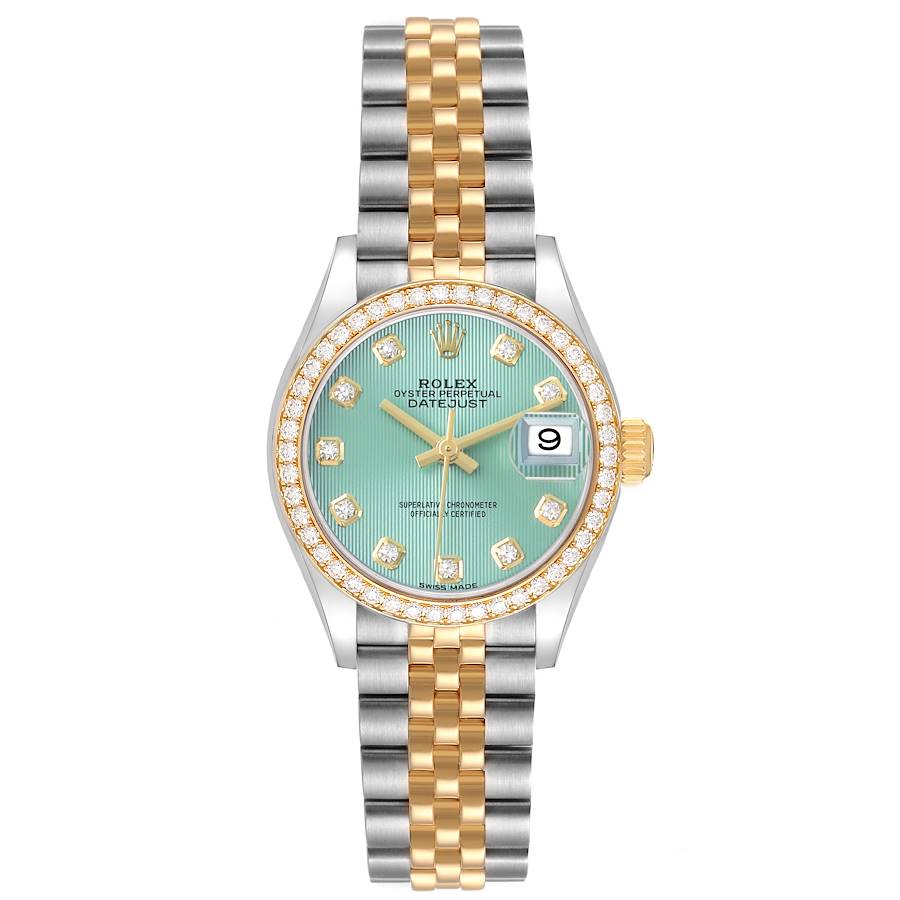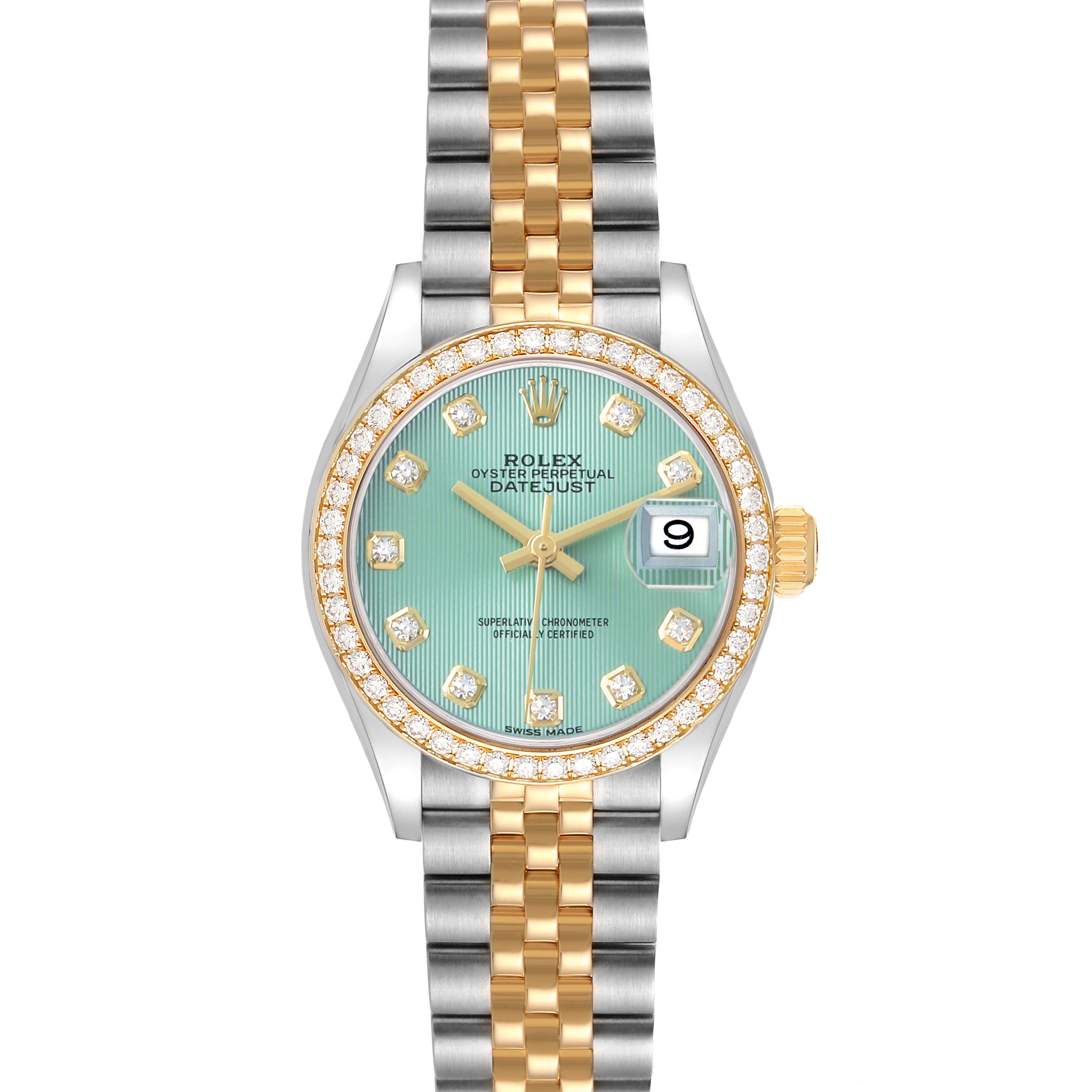 Rolex Datejust 28 Diamonds Steel Yellow Gold Ladies Watch 279383 Box Card. Officially certified chronometer self-winding movement. Stainless steel and 18K yellow gold oyster case 28.0 mm in diameter. Rolex logo on the crown. 18k yellow gold original Rolex factory diamond bezel. Scratch resistant sapphire crystal with a cyclops magnifier. Mint green tapestry dial with original Rolex factory diamond hour markers and yellow gold baton hands. Date calendar at the 3 o'clock aperture. Stainless steel and 18K yellow gold jubilee bracelet with a hidden folding clasp. Fits up to a 6.5" wrist.