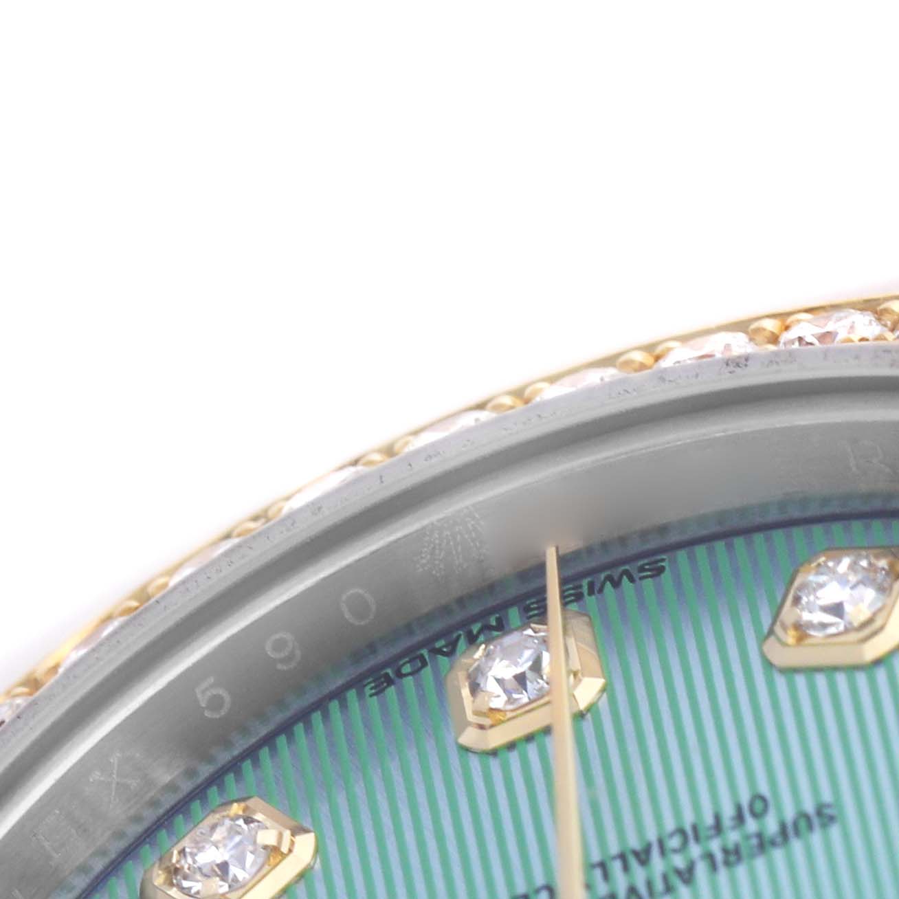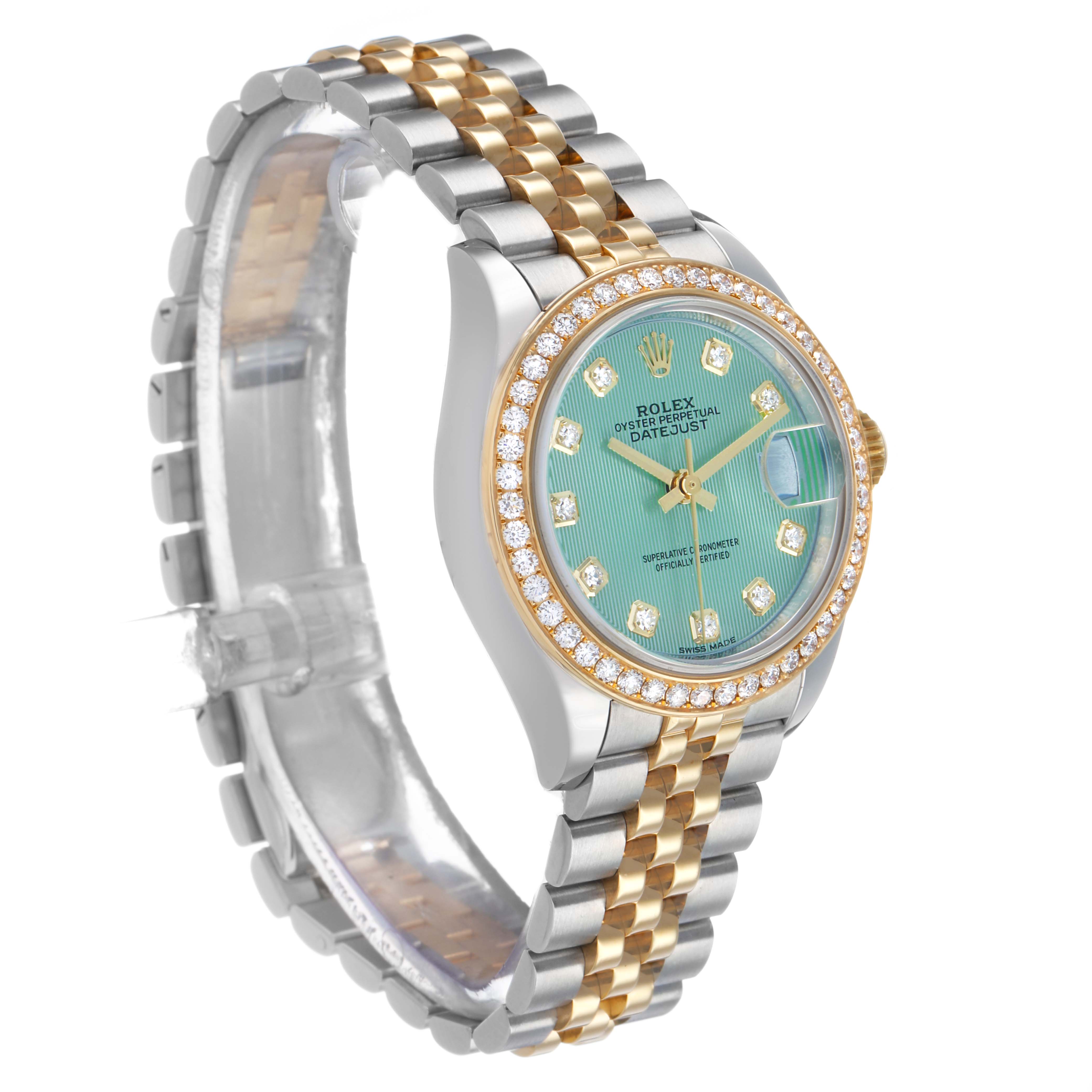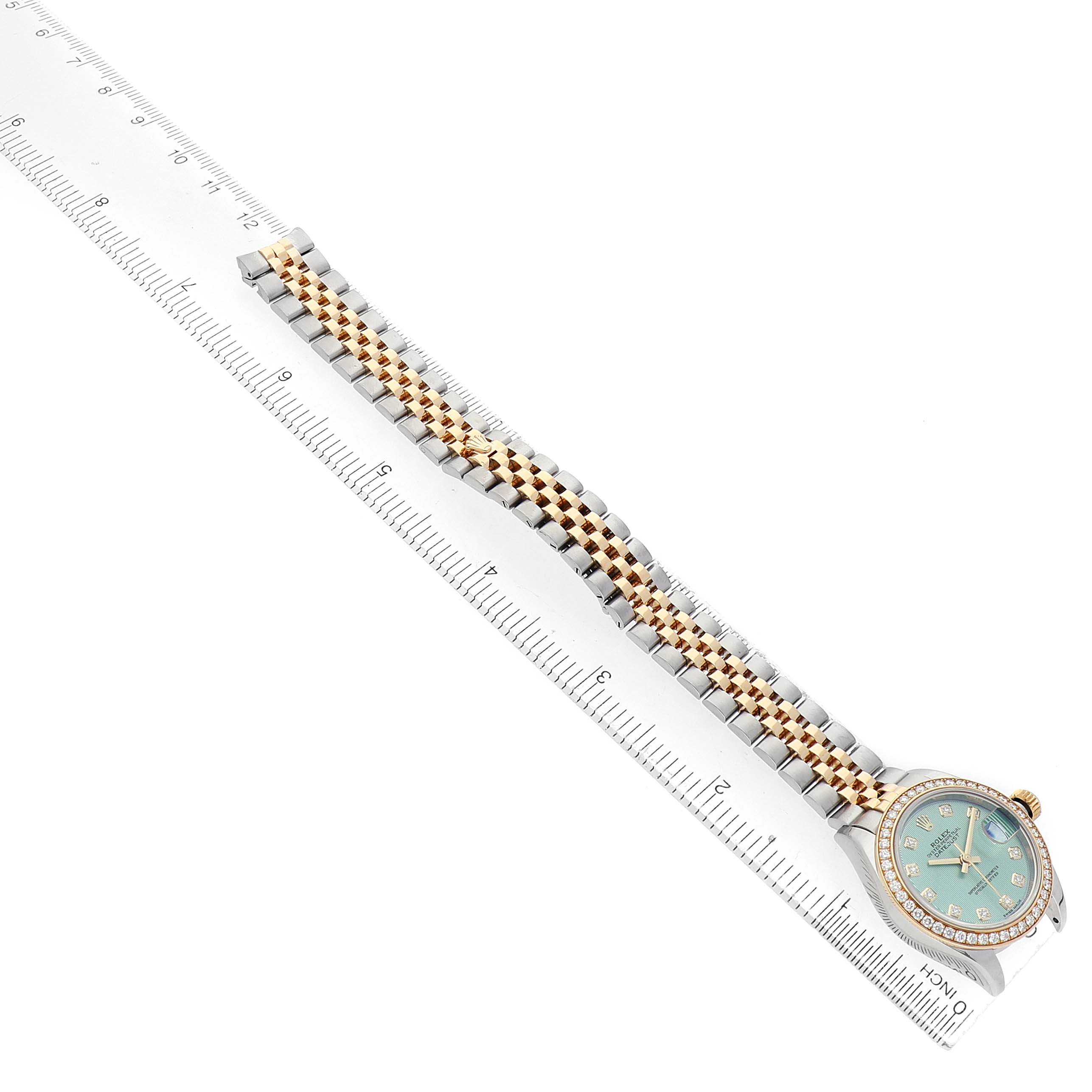 Rolex Datejust 28 Diamonds Steel Yellow Gold Ladies Watch 279383 Box Card. Officially certified chronometer self-winding movement. Stainless steel and 18K yellow gold oyster case 28.0 mm in diameter. Rolex logo on the crown. 18k yellow gold original Rolex factory diamond bezel. Scratch resistant sapphire crystal with a cyclops magnifier. Mint green tapestry dial with original Rolex factory diamond hour markers and yellow gold baton hands. Date calendar at the 3 o'clock aperture. Stainless steel and 18K yellow gold jubilee bracelet with a hidden folding clasp. Fits up to a 6.5" wrist.