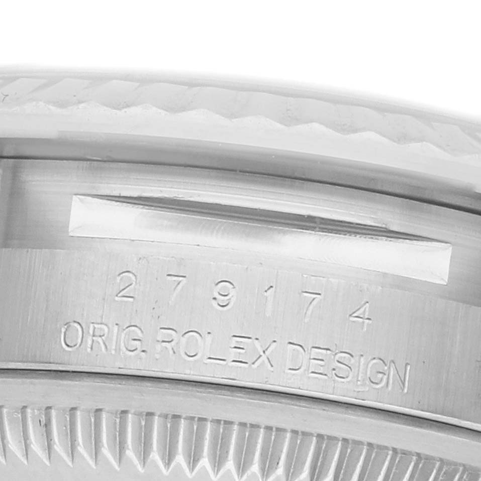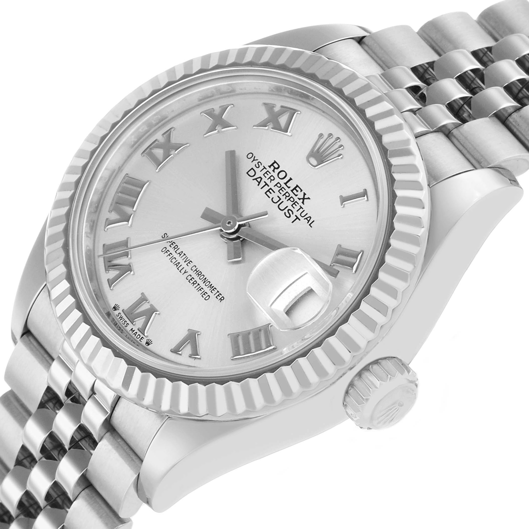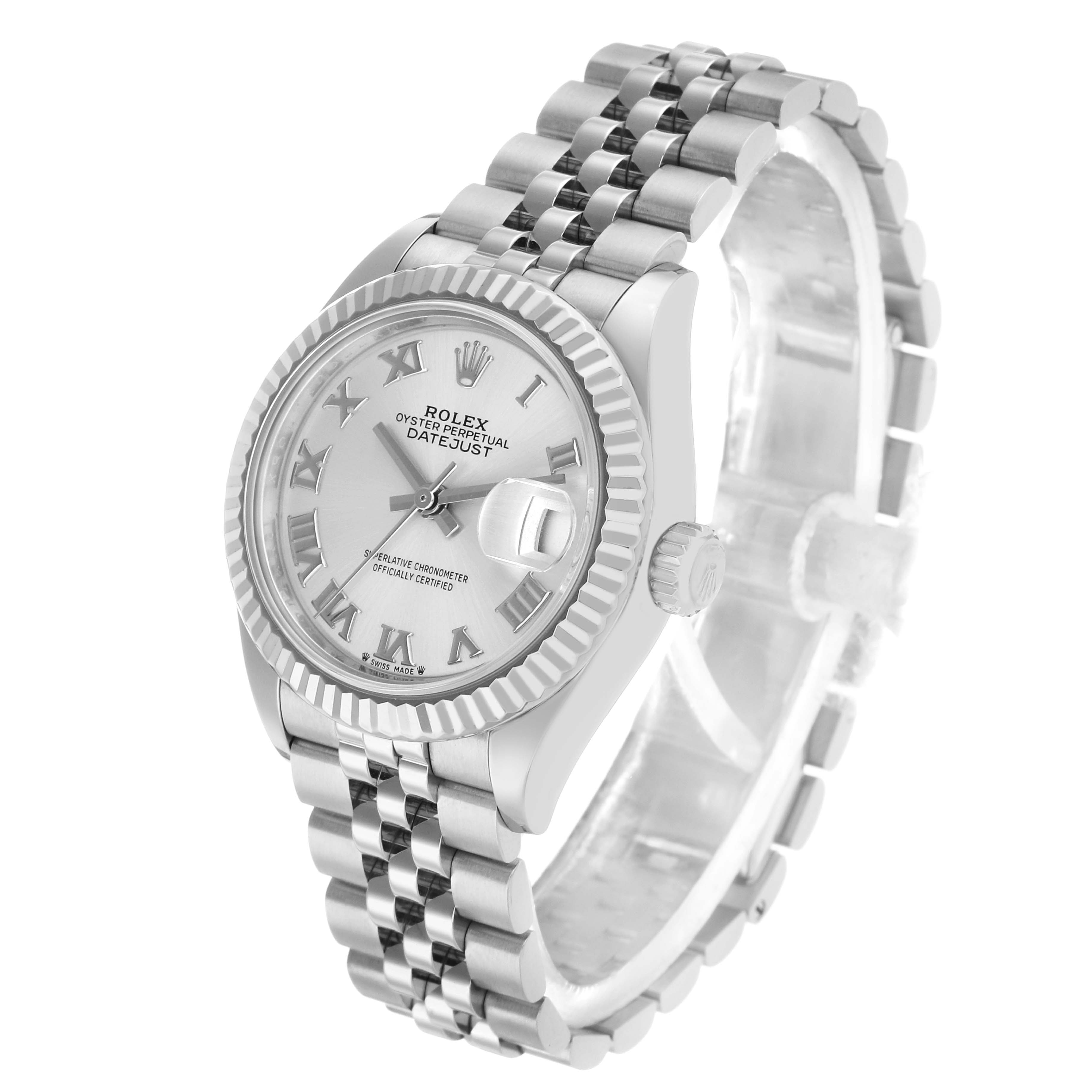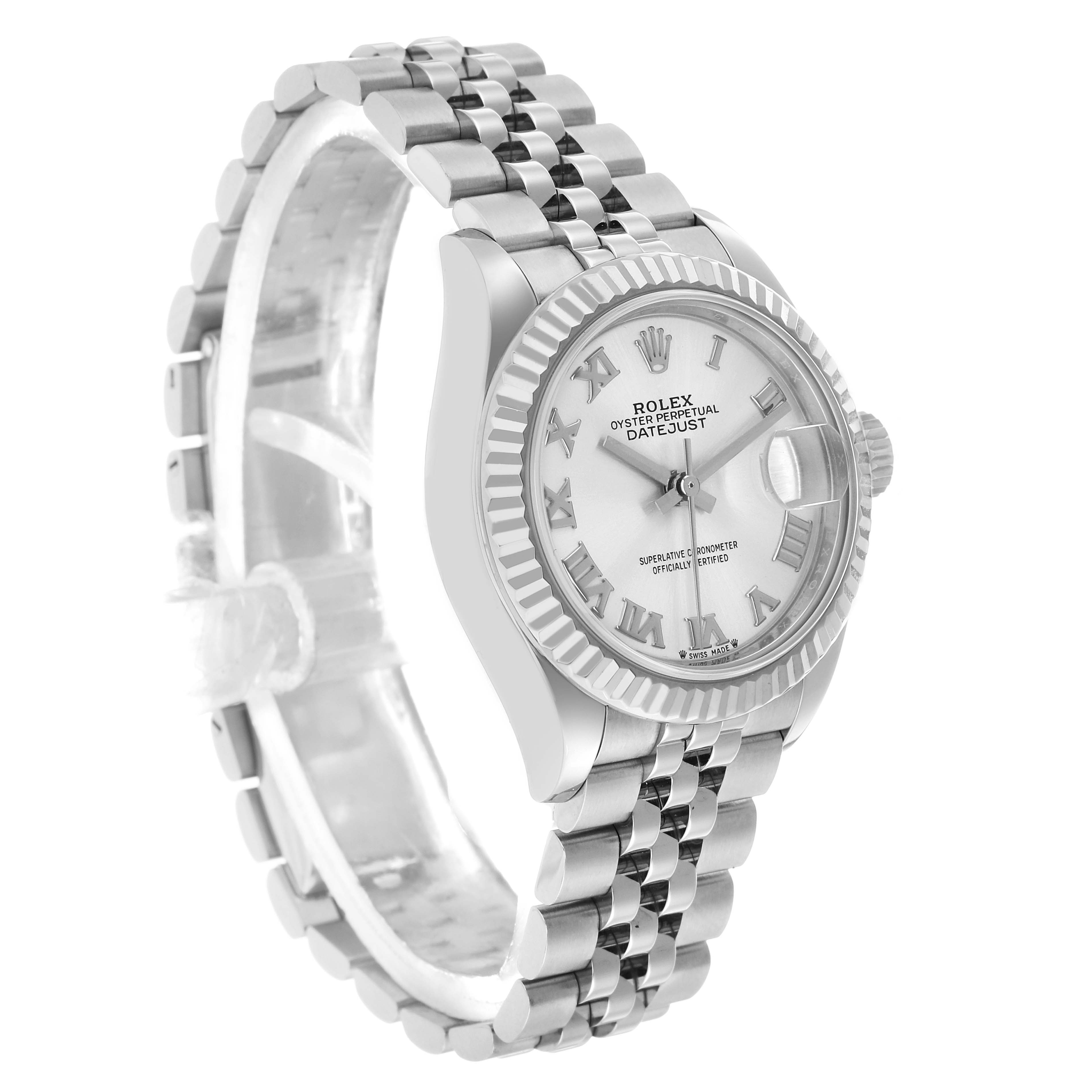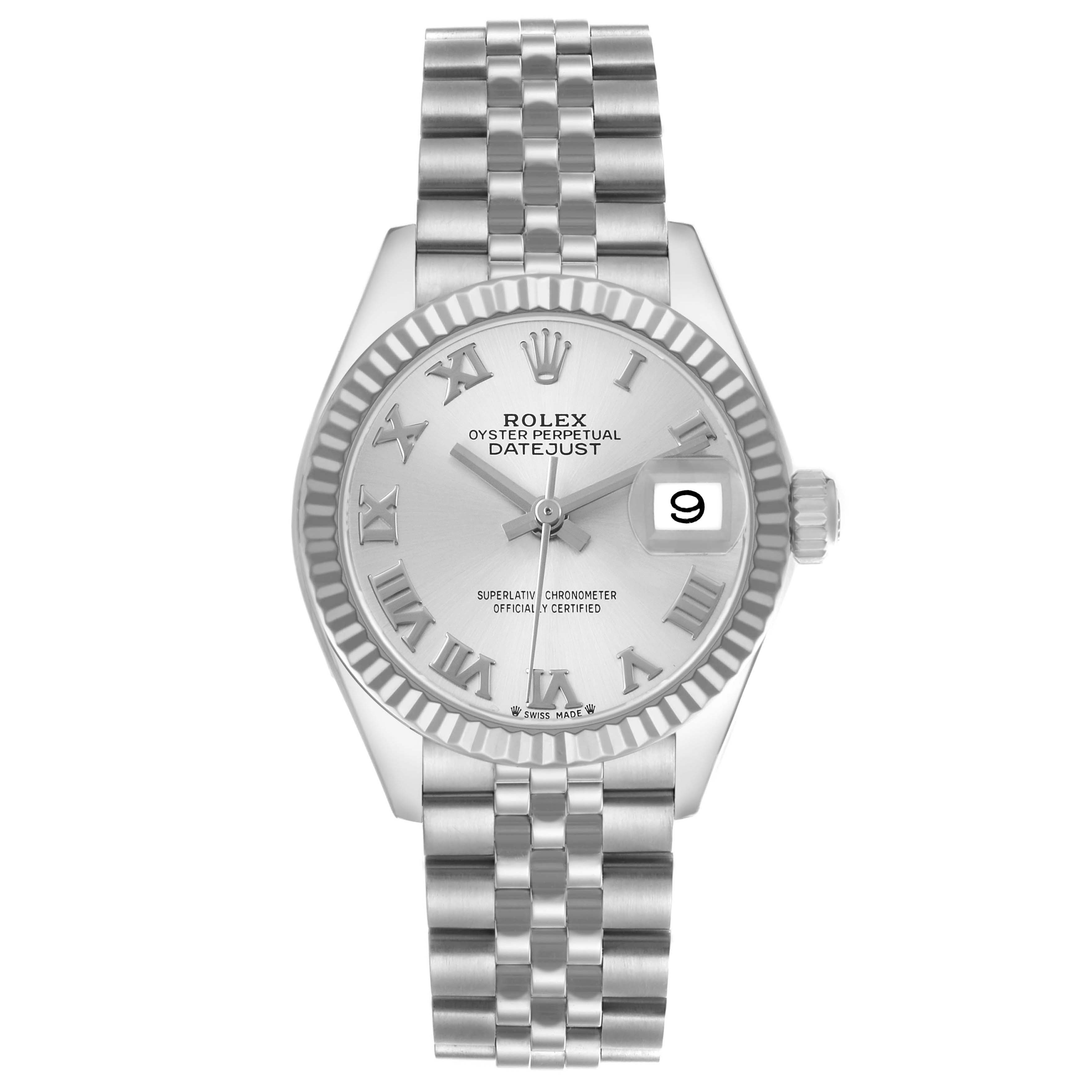 Rolex Datejust 28 Steel White Gold Silver Dial Ladies Watch 279174. Officially certified chronometer self-winding movement. Stainless steel oyster case 28.0 mm in diameter. Rolex logo on crown. 18K white gold fluted bezel. Scratch resistant sapphire crystal with cyclops magnifier. Silver dial with raised Roman numeral hour markers. Date calendar at 3 o'clock aperture. Stainless steel jubilee bracelet with a hidden clasp. Fits a 6" wrist.