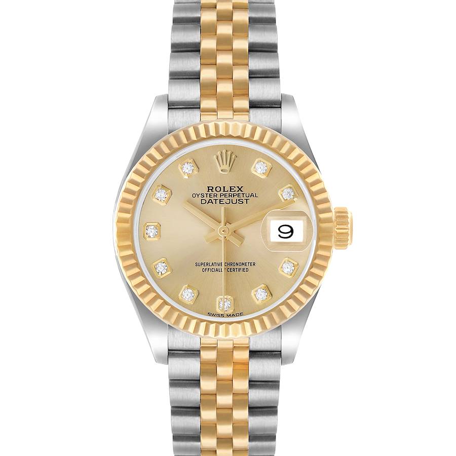 Rolex Datejust 28 Steel Yellow Gold Diamond Ladies Watch 279173. Officially certified chronometer automatic self-winding movement. Stainless steel oyster case 28.0 mm in diameter. Rolex logo on the 18K yellow gold crown. 18k yellow gold fluted bezel. Scratch resistant sapphire crystal with cyclops magnifier. Champagne dial with original Rolex factory diamond hour markers and yellow gold baton hands. Date calendar at the 3 o'clock aperture. Stainless steel and 18k yellow gold jubilee bracelet with a hidden clasp. Fits a 6 1/4" wrist.