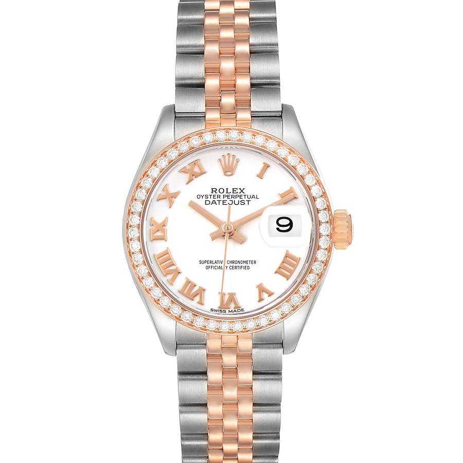 Rolex Datejust 28 White Roman Dial Steel Rose Gold Diamond Ladies Watch 279381. Officially certified chronometer self-winding movement. Stainless steel oyster case 28.0 mm in diameter. Rolex logo on a 18K rose gold crown. 18k rose gold original Rolex factory diamond bezel. Scratch resistant sapphire crystal with cyclops magnifier. White dial with raised roman numeral hour markers. Date calendar at 3 o'clock aperture. Stainless steel and 18k rose gold jubilee bracelet with a hidden clasp. Fits 6 1/4" wrist.