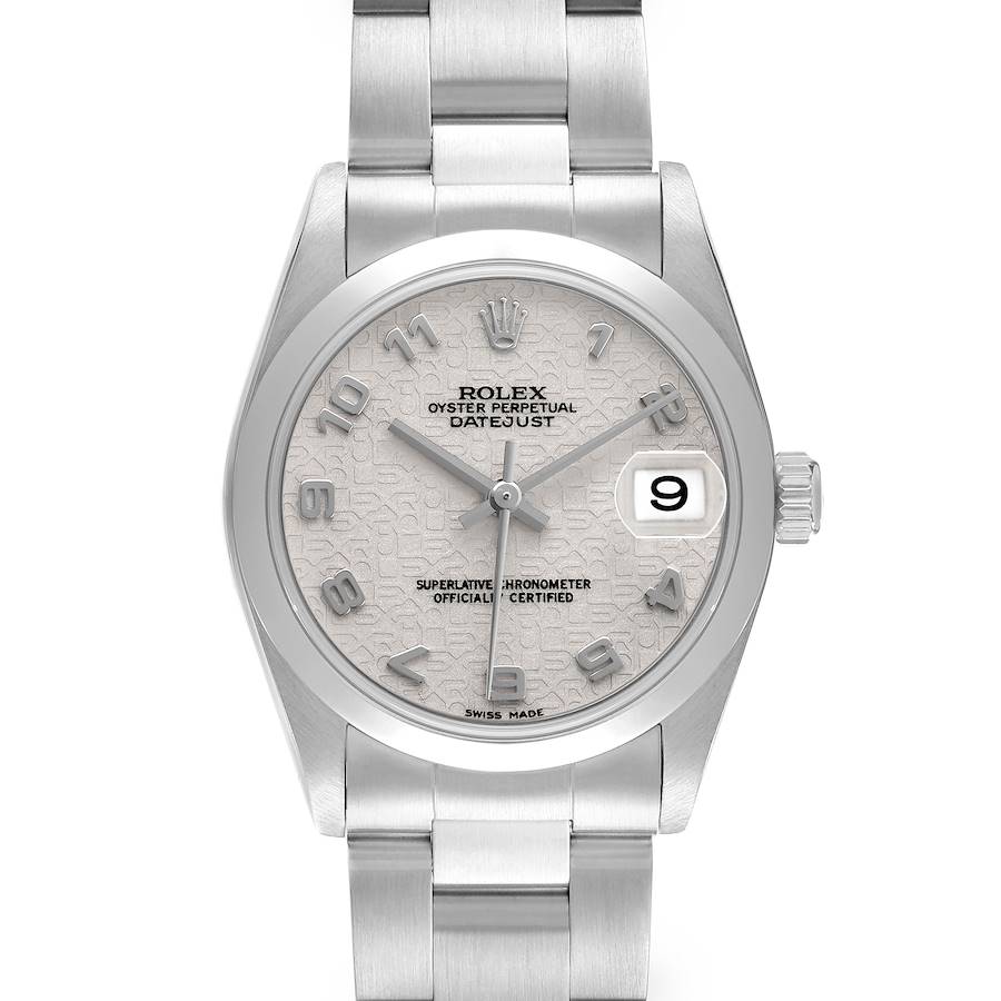 Rolex Datejust 31 Midsize Jubilee Dial Steel Womens Watch 78240. Officially certified chronometer self-winding movement with quickset date function. Stainless steel oyster case 31.0 mm in diameter. Rolex logo on a crown. Stainless steel smooth domed bezel. Scratch resistant sapphire crystal. Silver jubilee anniversary dial with raised arabic numerals. Date window at 3 o'clock aperture. Stainless steel oyster bracelet with fold over clasp. Fits 7" wrist.