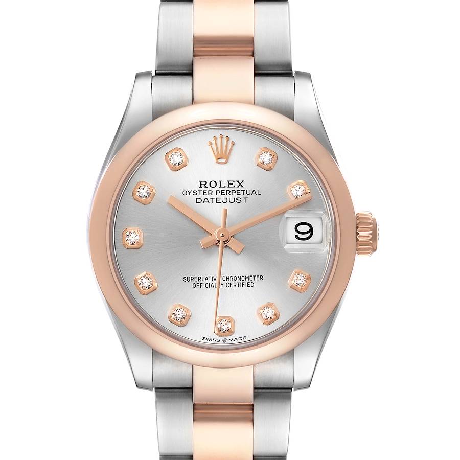 Rolex Datejust 31 Midsize Steel Rose Gold Diamond Dial Watch 278241 Box Card. Officially certified chronometer self-winding movement with quickset date function. Stainless steel oyster case 31.0 mm in diameter. Rolex logo on a rose gold crown. 18K rose gold domed bezel. Scratch resistant sapphire crystal with cyclops magnifier. Silver dial with original Rolex factory diamond hour markers. Date calendar at 3 o'clock aperture. Stainless steel and 18k rose gold oyster bracelet with a fold over clasp. Fits a 7 1/4" wrist.