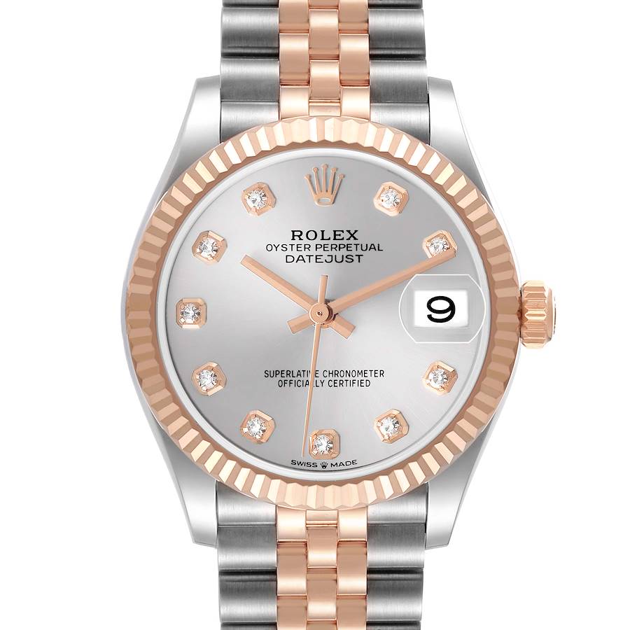 Rolex Datejust 31 Midsize Steel Rose Gold Diamond Ladies Watch 278271 Box Card. Officially certified chronometer self-winding movement. Stainless steel oyster case 31 mm in diameter. Rolex logo on 18K rose gold crown. 18k rose gold fluted bezel. Scratch resistant sapphire crystal with cyclops magnifier. Silver dial with original Rolex factory diamond hour markers. Date calendar at 3 o'clock aperture. Stainless steel and 18k rose gold jubilee bracelet with hidden clasp. Fits a 6 3/4" wrist.