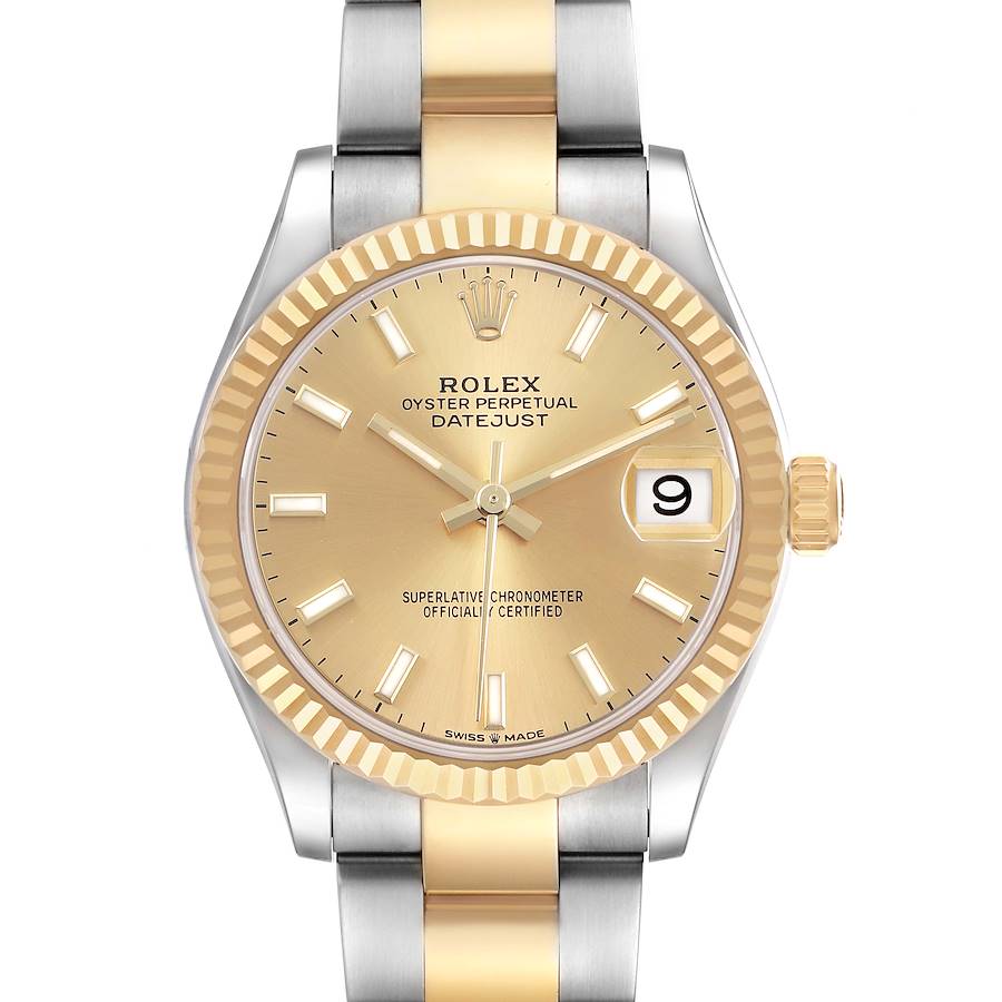 Rolex Datejust 31 Midsize Steel Yellow Gold Ladies Watch 278273 Card. Officially certified chronometer self-winding movement. Stainless steel oyster case 31.0 mm in diameter. Rolex logo on 18K yellow gold crown. 18k yellow gold fluted bezel. Scratch resistant sapphire crystal with cyclops magnifier. Champagne dial with baton hour markers. Date calendar at 3 o'clock aperture. Stainless steel and 18k yellow gold oyster bracelet with oyster lock clasp. Fits a 7" wrist.
