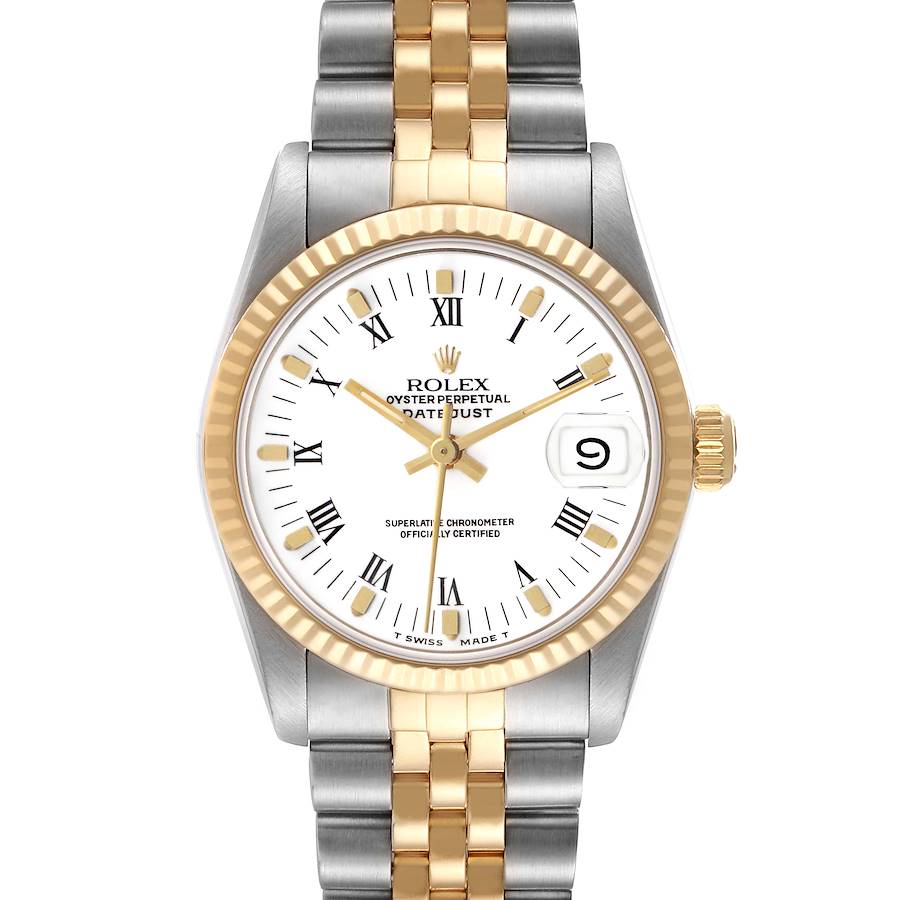 Rolex Datejust 31 Midsize Steel Yellow Gold Roman Dial Ladies Watch 68273. Officially certified chronometer automatic self-winding movement. Stainless steel oyster case 31.0 mm in diameter. Rolex logo on the 18K yellow gold crown. 18k yellow gold fluted bezel. Scratch resistant sapphire crystal with a cyclops magnifier. White dial with black Roman numeral hour markers and tritium-inlay yellow gold baton hands. Date calendar at the 3 o'clock aperture. Outer minute marker track. Stainless steel and 18k yellow gold jubilee bracelet with a fold-over clasp. Fits a 6 3/4" wrist.