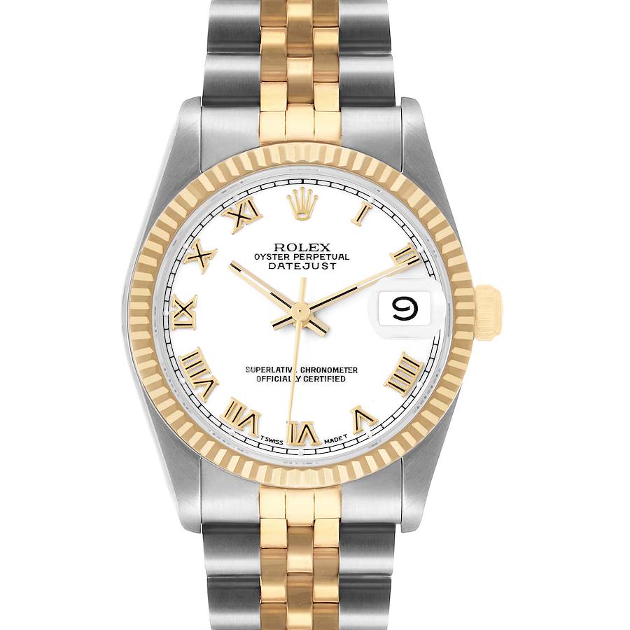 Rolex Datejust 31 Midsize Steel Yellow Gold White Roman Dial Ladies Watch 68273. Officially certified chronometer automatic self-winding movement. Stainless steel oyster case 31.0 mm in diameter. Rolex logo on the 18K yellow gold crown. 18k yellow gold fluted bezel. Scratch resistant sapphire crystal with a cyclops magnifier. White dial with raised yellow gold Roman numeral hour markers and tritium-inlay yellow gold baton hands. Date calendar at the 3 o'clock aperture. Outer minute marker track. Stainless steel and 18k yellow gold jubilee bracelet with a fold-over clasp. Fits a 6 3/4" wrist.