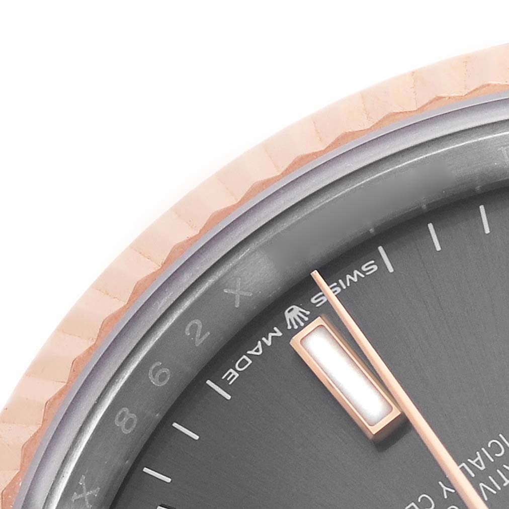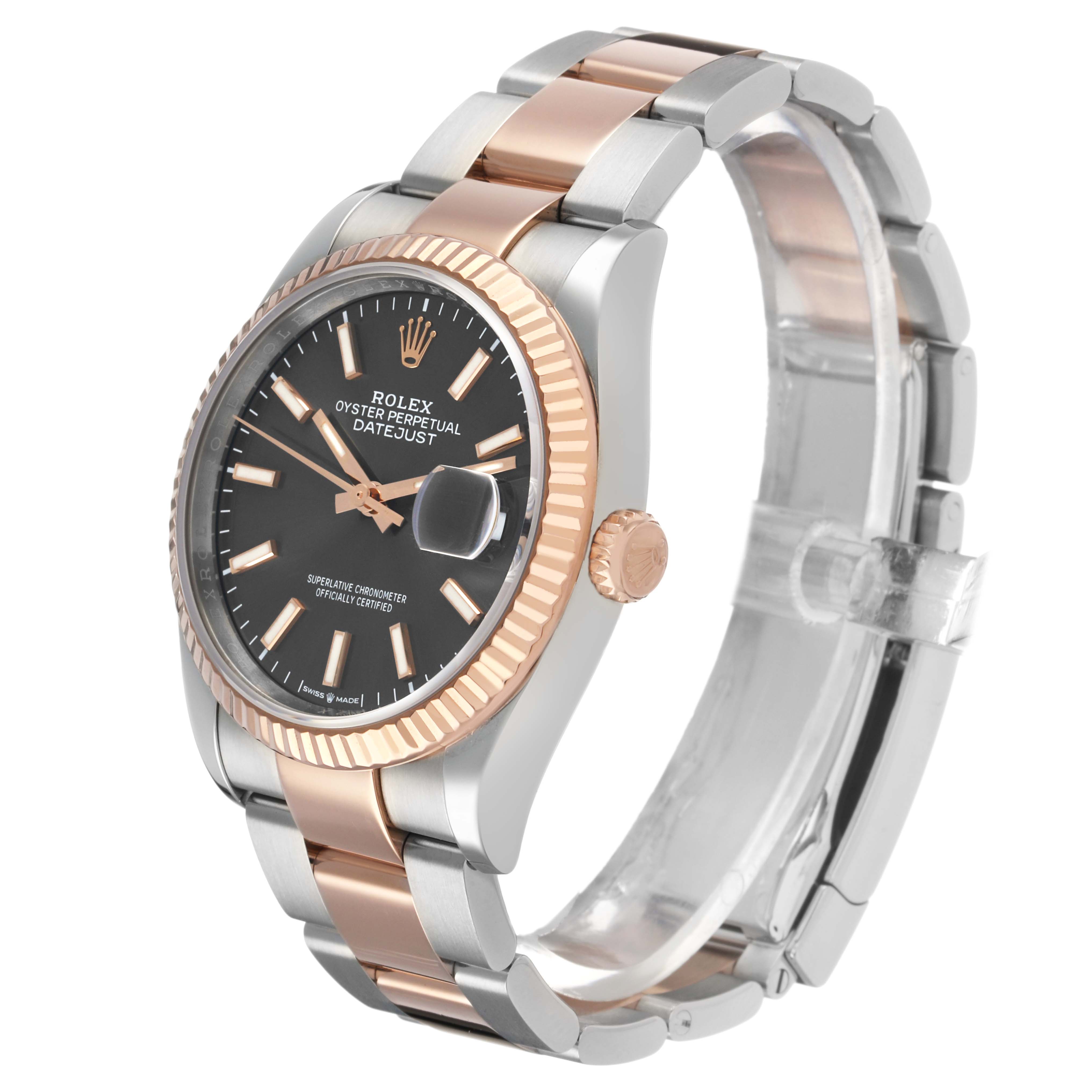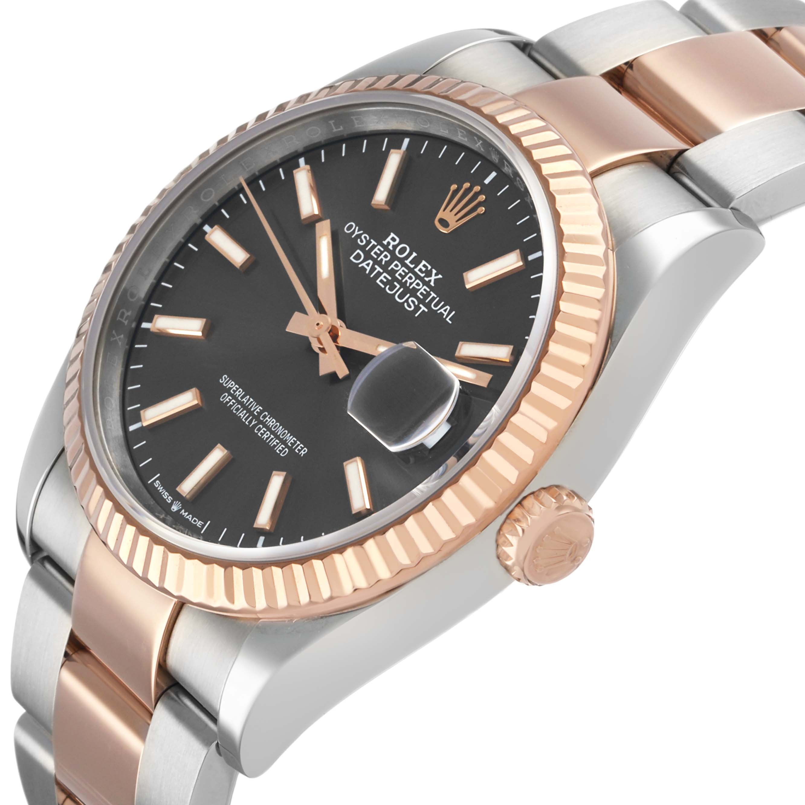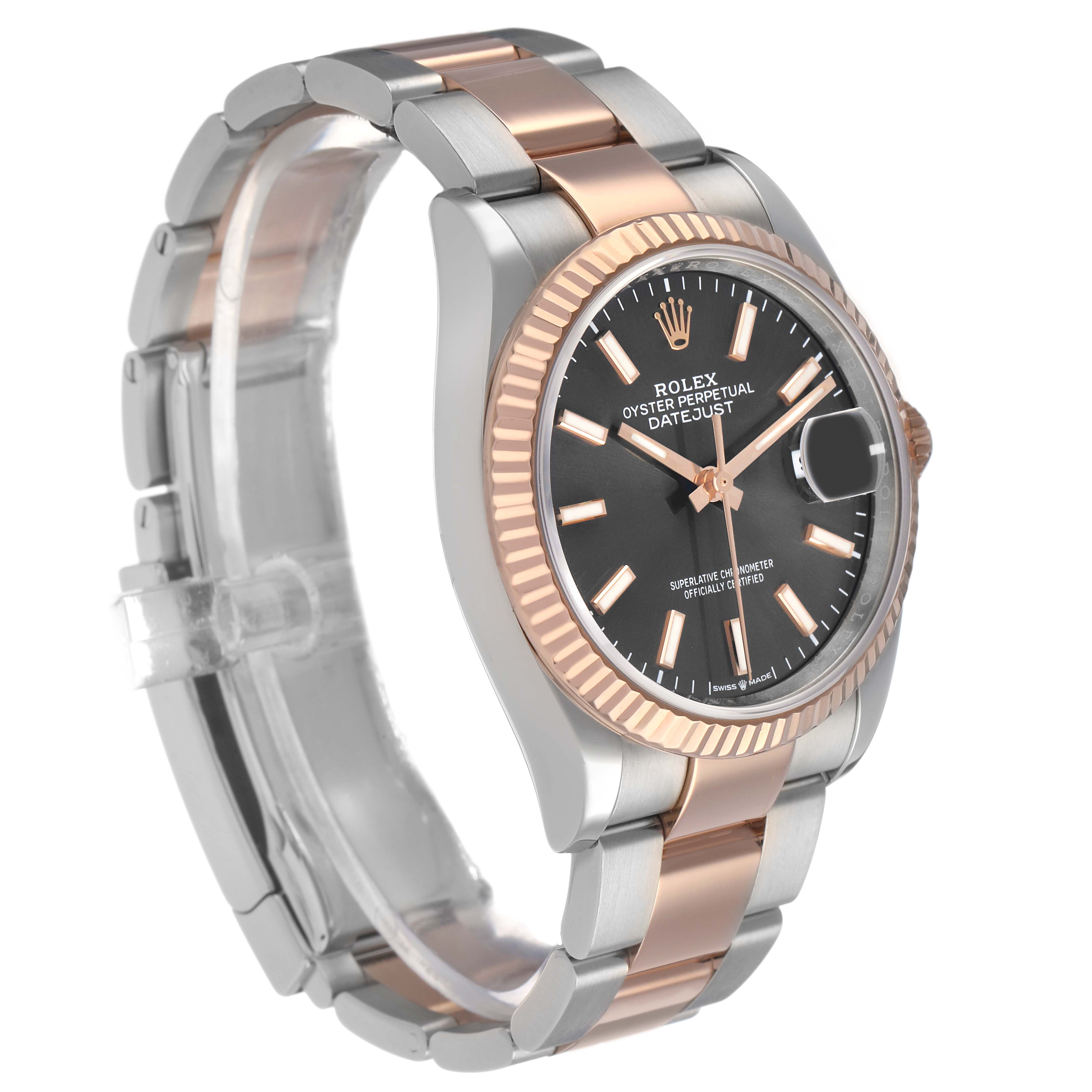 Rolex Datejust 36 Rhodium Dial Steel Rose Gold Mens Watch 126231. Officially certified chronometer automatic self-winding movement. Stainless steel oyster case 36.0 mm in diameter. High polished lugs. Rolex logo on the Everose 18K rose gold crown. 18k rose gold fluted bezel. Scratch resistant sapphire crystal with a cyclops magnifier. Slate dial with luminescent baton hands and hour markers. Date calendar at the 3 o'clock aperture. Stainless steel and Everose 18k rose gold oyster bracelet with a fold-over clasp. Fits up to a 6 3/4" wrist.