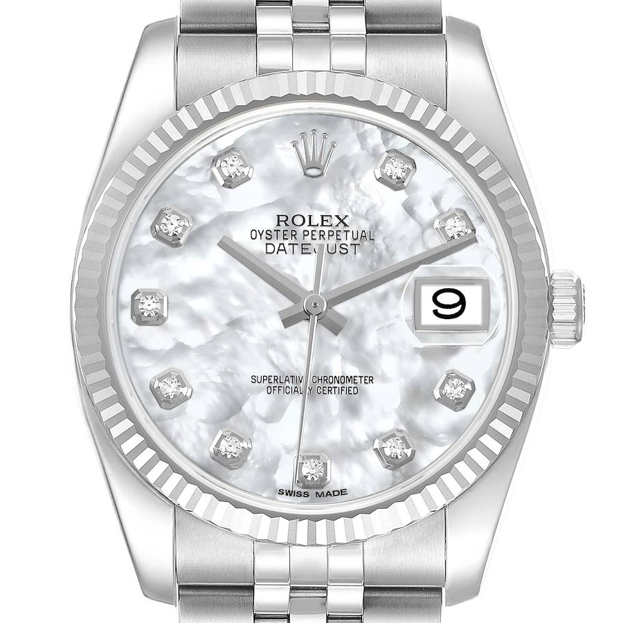 Rolex Datejust 36 Steel White Gold MOP Diamond Dial Mens Watch 116234 Box Card. Officially certified chronometer self-winding movement. Stainless steel case 36 mm in diameter. Rolex logo on the crown. 18K white gold fluted bezel. Scratch resistant sapphire crystal with cyclops magnifier. Mother of pearl dial with original Rolex factory diamond hour markers. Date window at 3 o'clock aperture. Stainless steel jubilee bracelet with a hidden clasp. Fits 7 1/4" wrist.