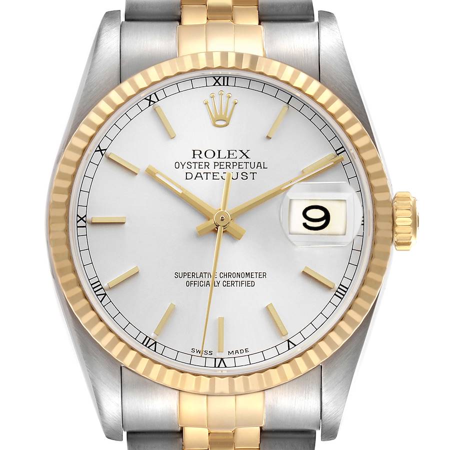 Rolex Datejust 36 Steel Yellow Gold Silver Dial Mens Watch 16233. Officially certified chronometer automatic self-winding movement. Stainless steel oyster case 36.0 mm in diameter. Rolex logo on the 18k yellow gold crown. 18k yellow gold fluted bezel. Scratch resistant sapphire crystal with a cyclops magnifier. Silver dial with yellow gold baton hands and hour markers. Date calendar at the 3 o'clock aperture. Stainless steel and 18k yellow gold jubilee bracelet with a fold-over clasp. Fits a 7" wrist.