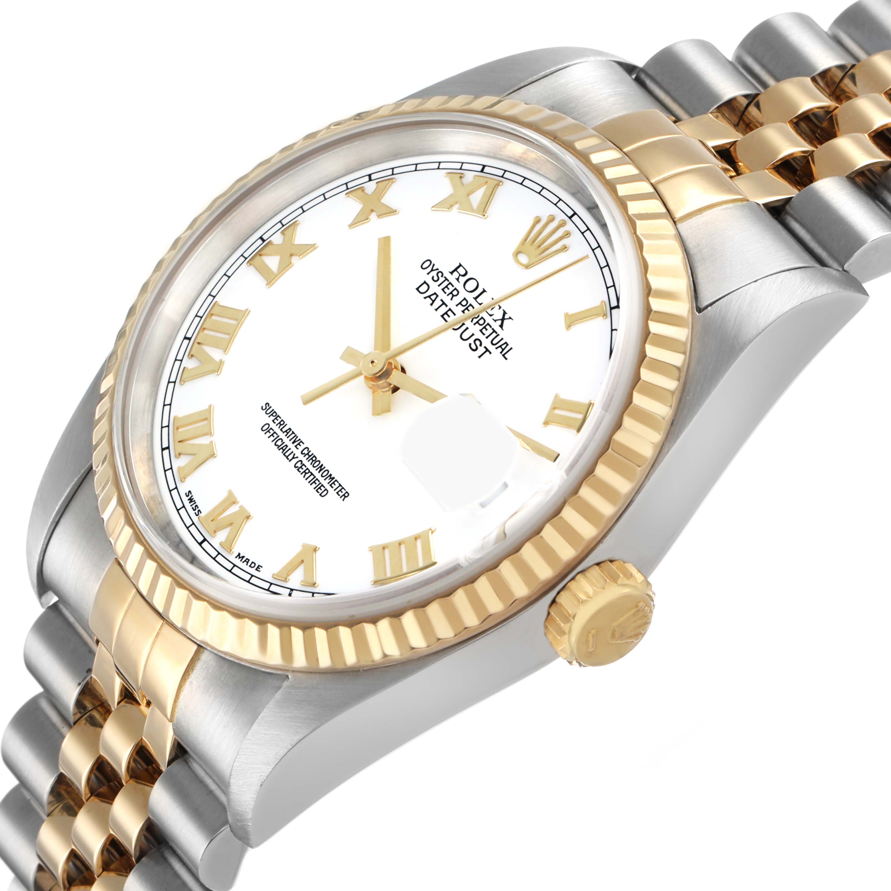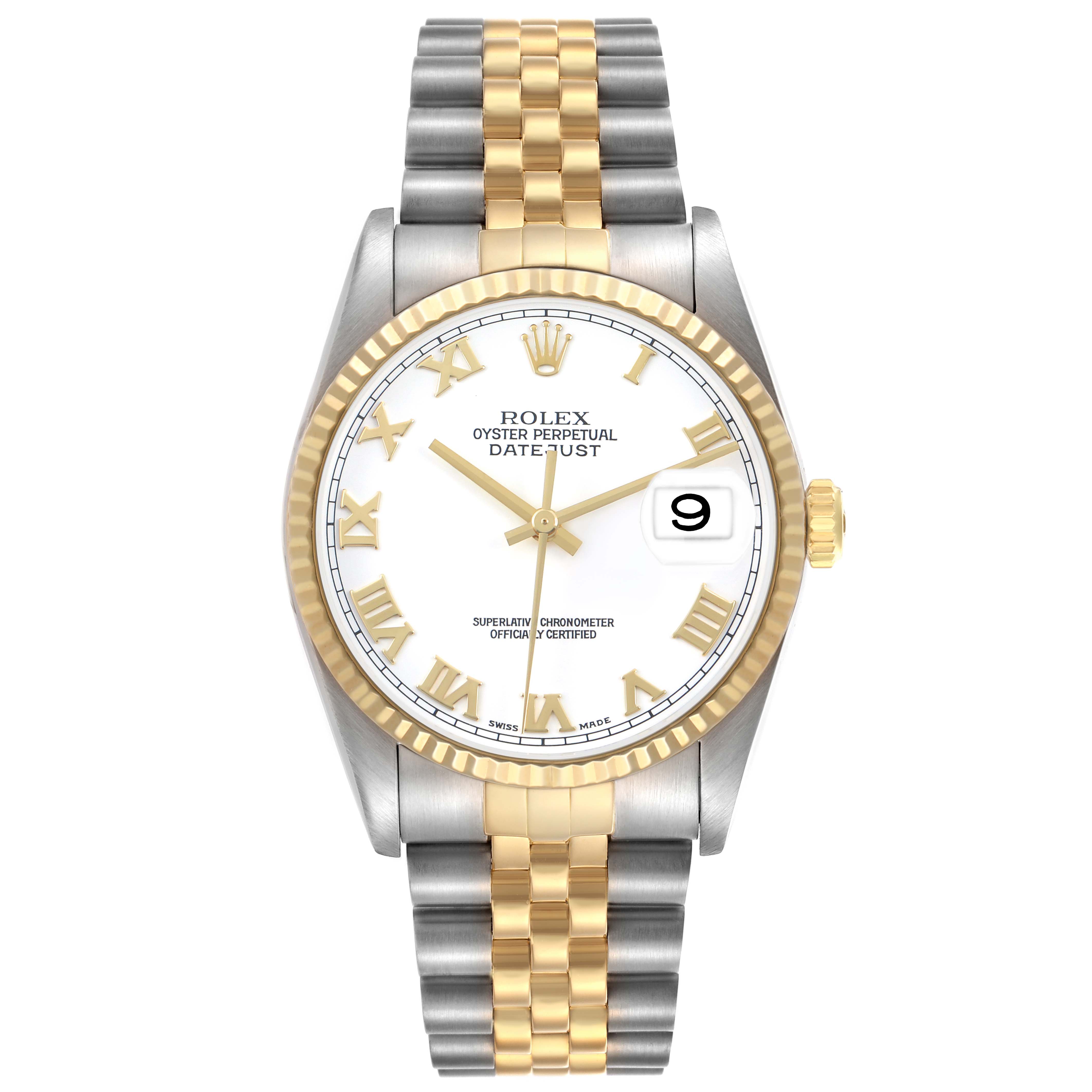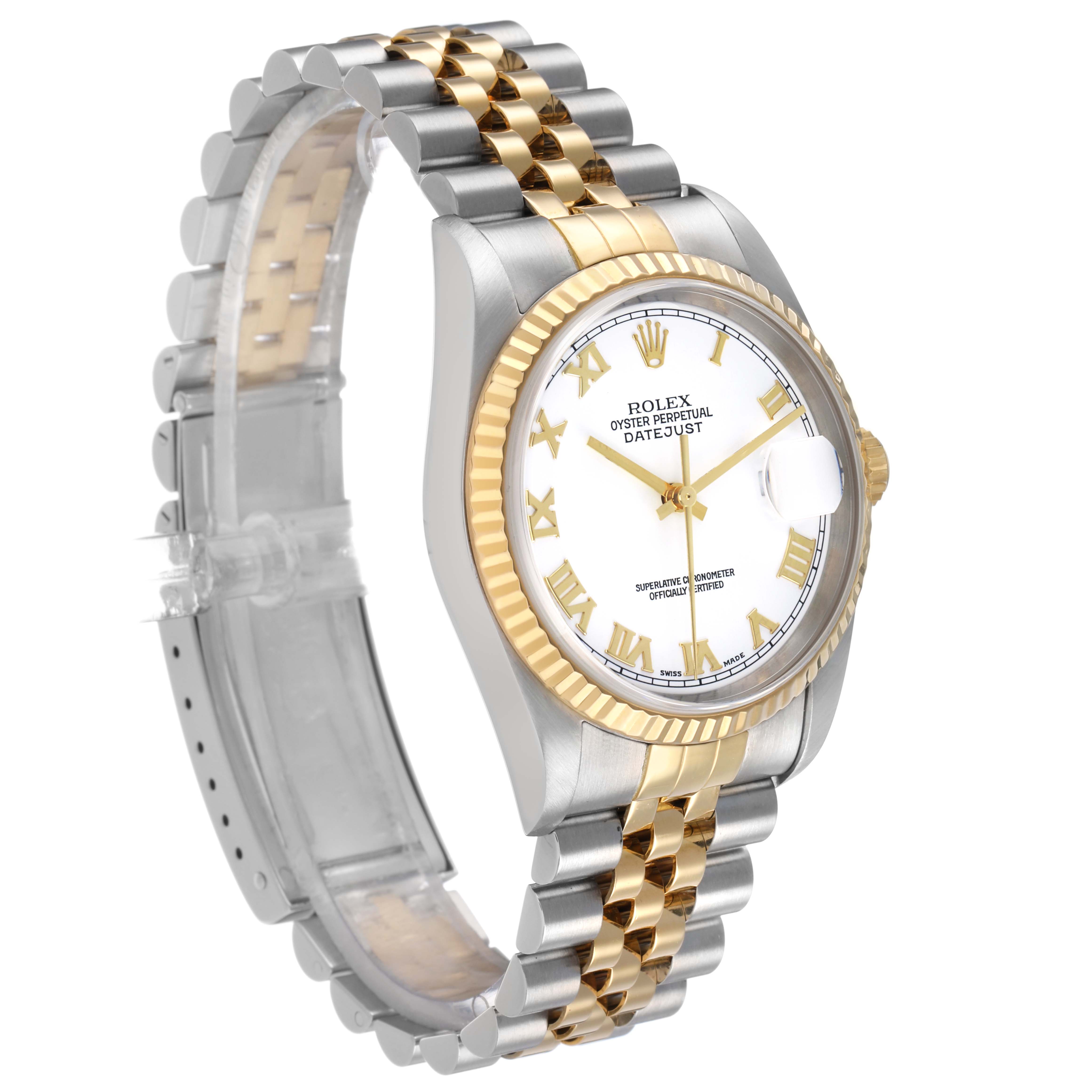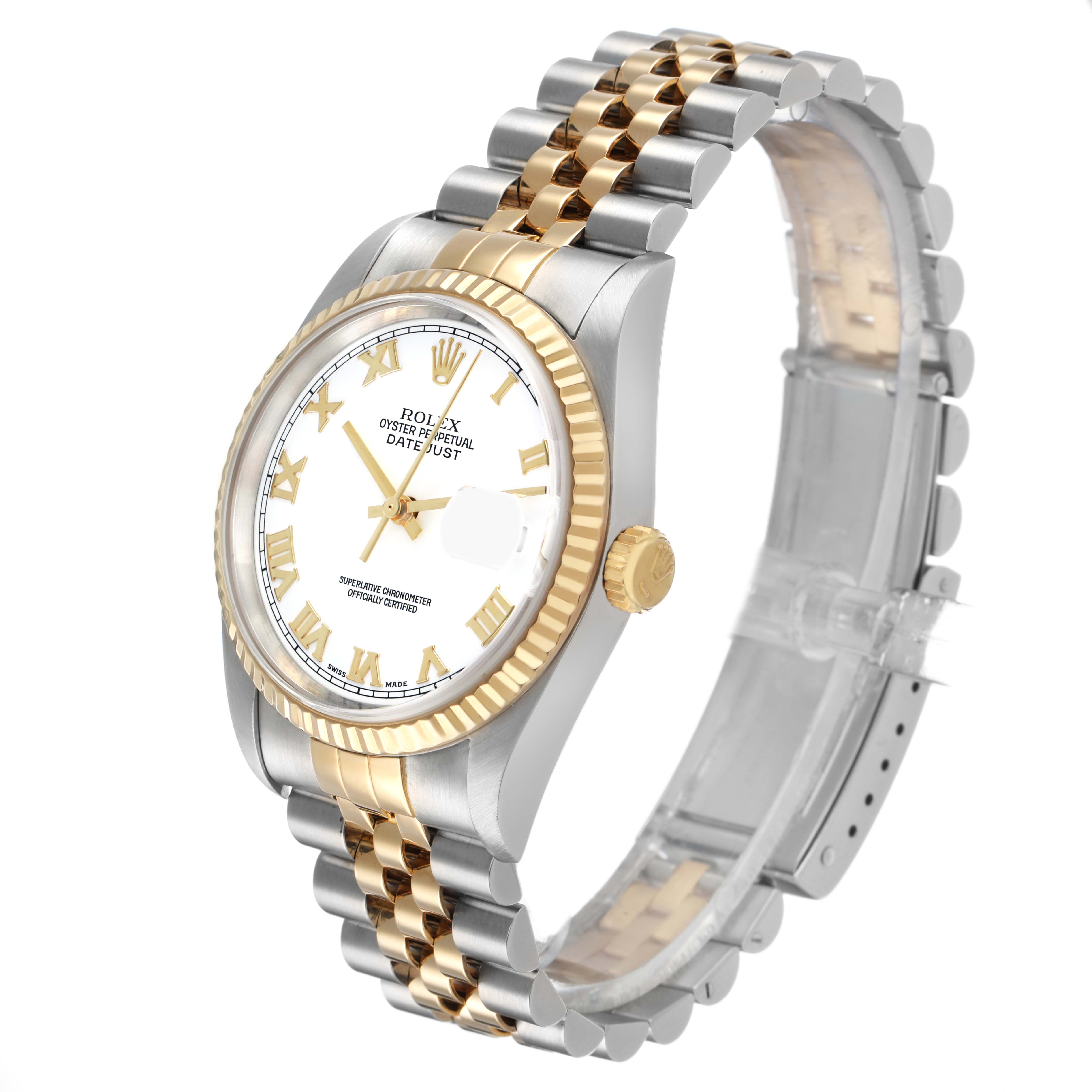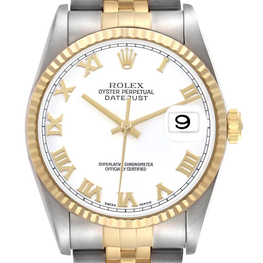 Rolex Datejust 36 White Roman Dial Steel Yellow Gold Mens Watch 16233 Box Papers. Officially certified chronometer automatic self-winding movement. Stainless steel oyster case 36.0 mm in diameter. Rolex logo on the 18K yellow gold crown. 18k yellow gold fluted bezel. Scratch resistant sapphire crystal with a cyclops magnifier. White dial with raised yellow gold Roman numeral hour markers and luminescent yellow gold hands. Date calendar at the 3 o'clock aperture. Stainless steel and 18k yellow gold jubilee bracelet with a fold-over clasp. Fits a 7.5" wrist.