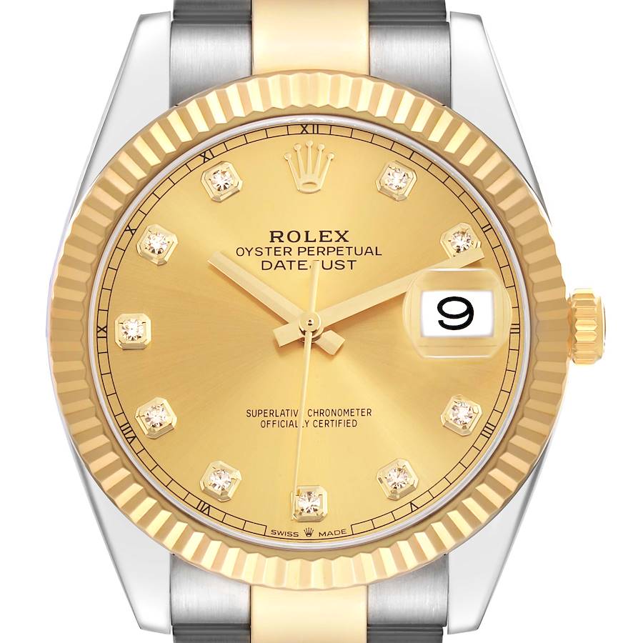 Rolex Datejust 41 Champagne Diamond Dial Steel Yellow Gold Mens Watch 126333. Officially certified chronometer automatic self-winding movement with quickset date. Stainless steel and 18K yellow gold case 41 mm in diameter. Rolex logo on the crown. 18K yellow gold fluted bezel. Scratch resistant sapphire crystal with cyclops magnifier. Champagne dial with original Rolex factory diamond hour markers. Date window at 3 o'clock aperture. Stainless steel and 18k yellow gold oyster bracelet with an Oysterlock clasp. Fits up to 7 3/4" wrist.