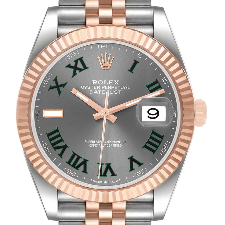Rolex Datejust 41 Steel Rose Gold Wimbledon Dial Mens Watch 126331. Officially certified chronometer self-winding movement. Stainless steel and 18K rose gold oyster case 41.0 mm in diameter. Rolex logo on the crown. 18K rose gold fluted bezel. Scratch resistant sapphire crystal with a cyclops magnifier. Grey Wimbledon dial with green Roman numeral hour markers and luminescent baton hands. Date calendar at the 3 o'clock aperture. Stainless steel and rose gold jubilee bracelet with a oysterlock clasp. Fits a 7 1/2" wrist.
