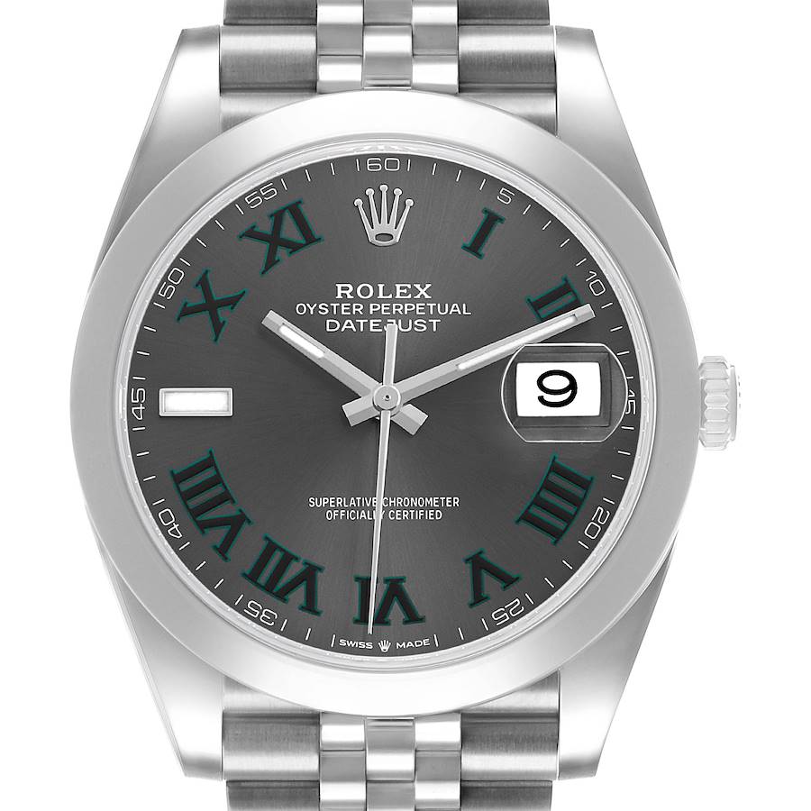 Rolex Datejust 41 Steel Wimbledon Dial Mens Watch 126300 Box Card. Officially certified chronometer automatic self-winding movement with quickset date. Stainless steel oyster case 41.0 mm in diameter. Rolex logo on the crown. Stainless steel smooth domed bezel. Scratch resistant sapphire crystal with a cyclops magnifier. Grey "Wimbledon" dial with luminescent baton hands and green Roman numeral hour markers. Minute markers around the outer rim. Date calendar at the 3 o'clock aperture. Stainless steel jubilee bracelet with an oysterlock clasp. Fits an 8" wrist.