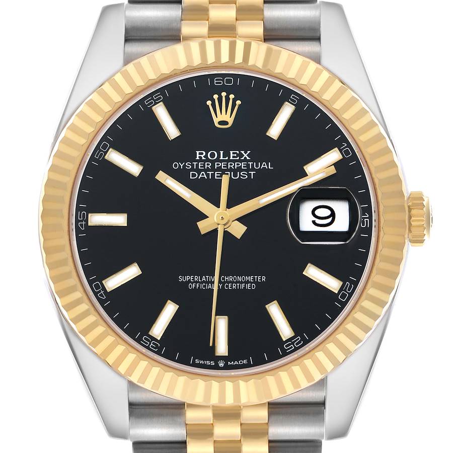 Rolex Datejust 41 Steel Yellow Gold Black Dial Mens Watch 126333. Officially certified chronometer automatic self-winding movement with quickset date. Stainless steel and 18K yellow gold oyster case 41.0 mm in diameter. Rolex logo on the 18k yellow gold crown. 18K yellow gold fluted bezel. Scratch resistant sapphire crystal with a cyclops magnifier. Black dial with luminescent yellow gold baton hands and hour markers. Date calendar at the 3 o'clock aperture. Stainless steel and 18k yellow gold jubilee bracelet with an Oysterlock clasp. Fits a 7.5" wrist.
