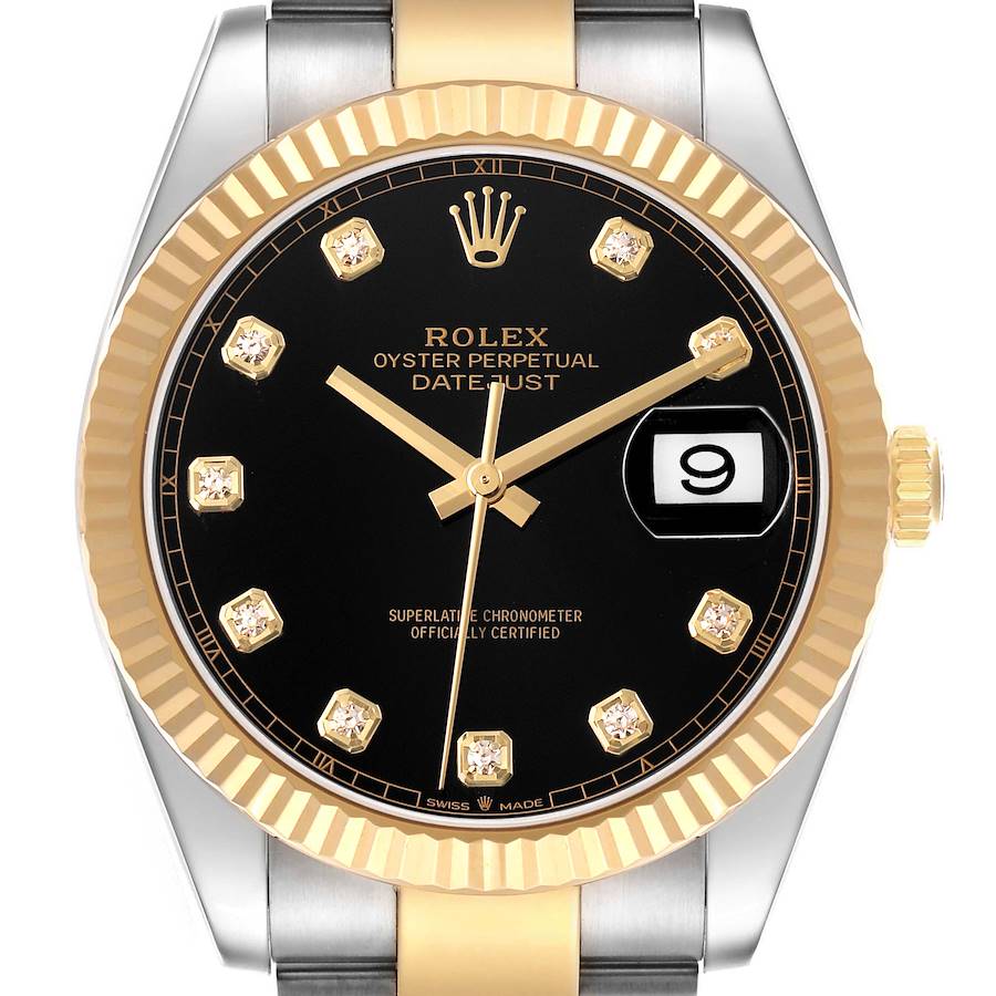 Rolex Datejust 41 Steel Yellow Gold Diamond Dial Mens Watch 126333 Box Card. Officially certified chronometer automatic self-winding movement with quickset date. Stainless steel and 18K yellow gold oyster case 41.0 mm in diameter. Rolex logo on the crown. 18K yellow gold fluted bezel. Scratch resistant sapphire crystal with a cyclops magnifier. Black dial with original Rolex factory diamond hour markers and yellow gold baton hands. Date calendar at the 3 o'clock aperture. Stainless steel and 18k yellow gold oyster bracelet with an Oysterlock clasp. Fits a 7 3/4" wrist.