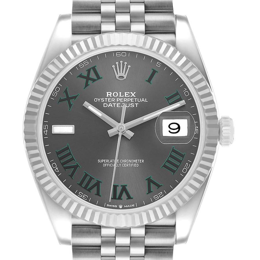 Rolex Datejust 41 Wimbledon Dial Steel White Gold Mens Watch 126334 Box Card. Officially certified chronometer automatic self-winding movement. Stainless steel oyster case 41.0 mm in diameter. Rolex logo on the crown. 18K white gold fluted bezel. Scratch resistant sapphire crystal with a cyclops magnifier. Grey "Wimbledon" dial with luminescent baton hands and green Roman numeral hour markers. Stick minute markers around the outer rim. Date calendar at the 3 o'clock aperture. Stainless steel jubilee bracelet with an Oysterlock clasp. Fits a 7 1/4" wrist.