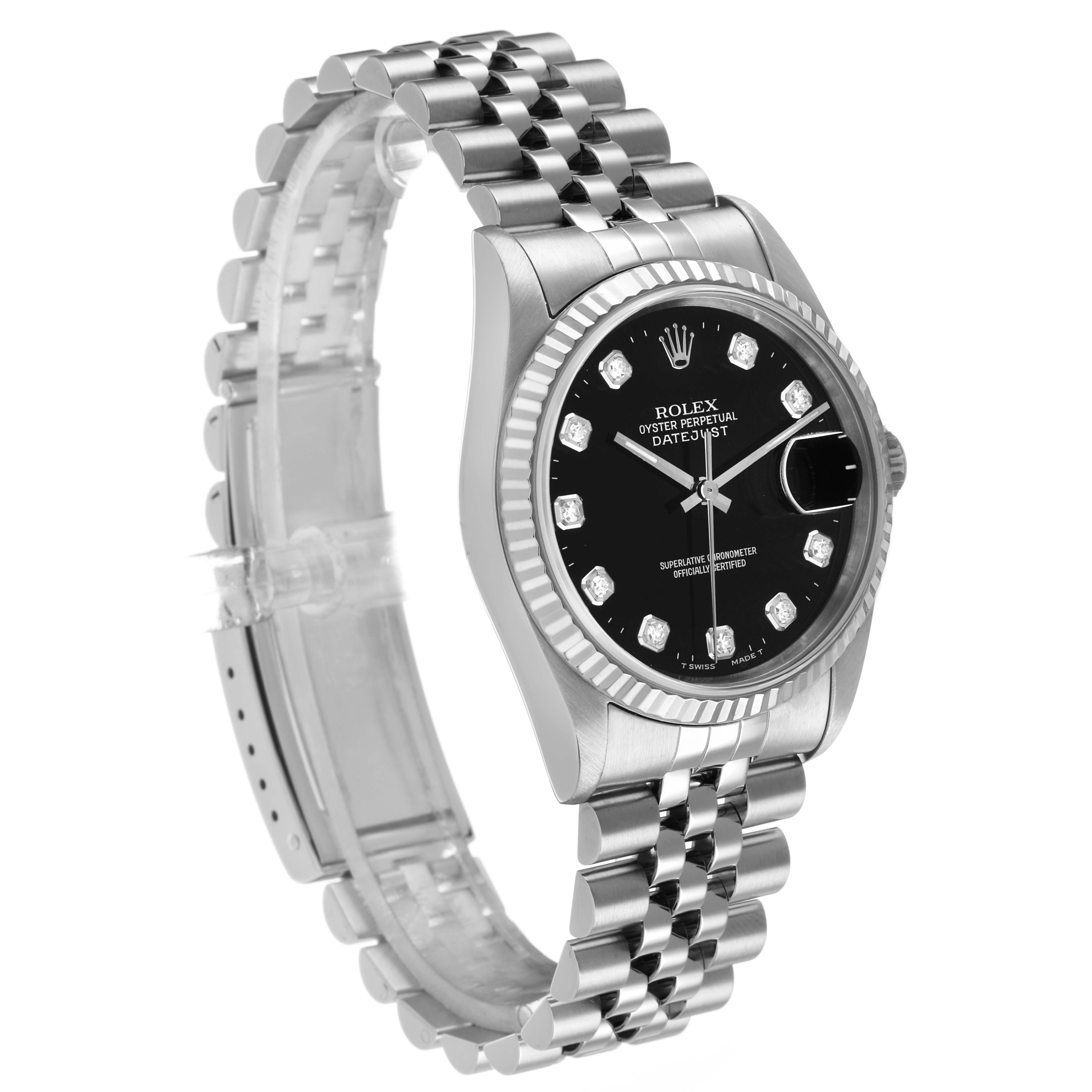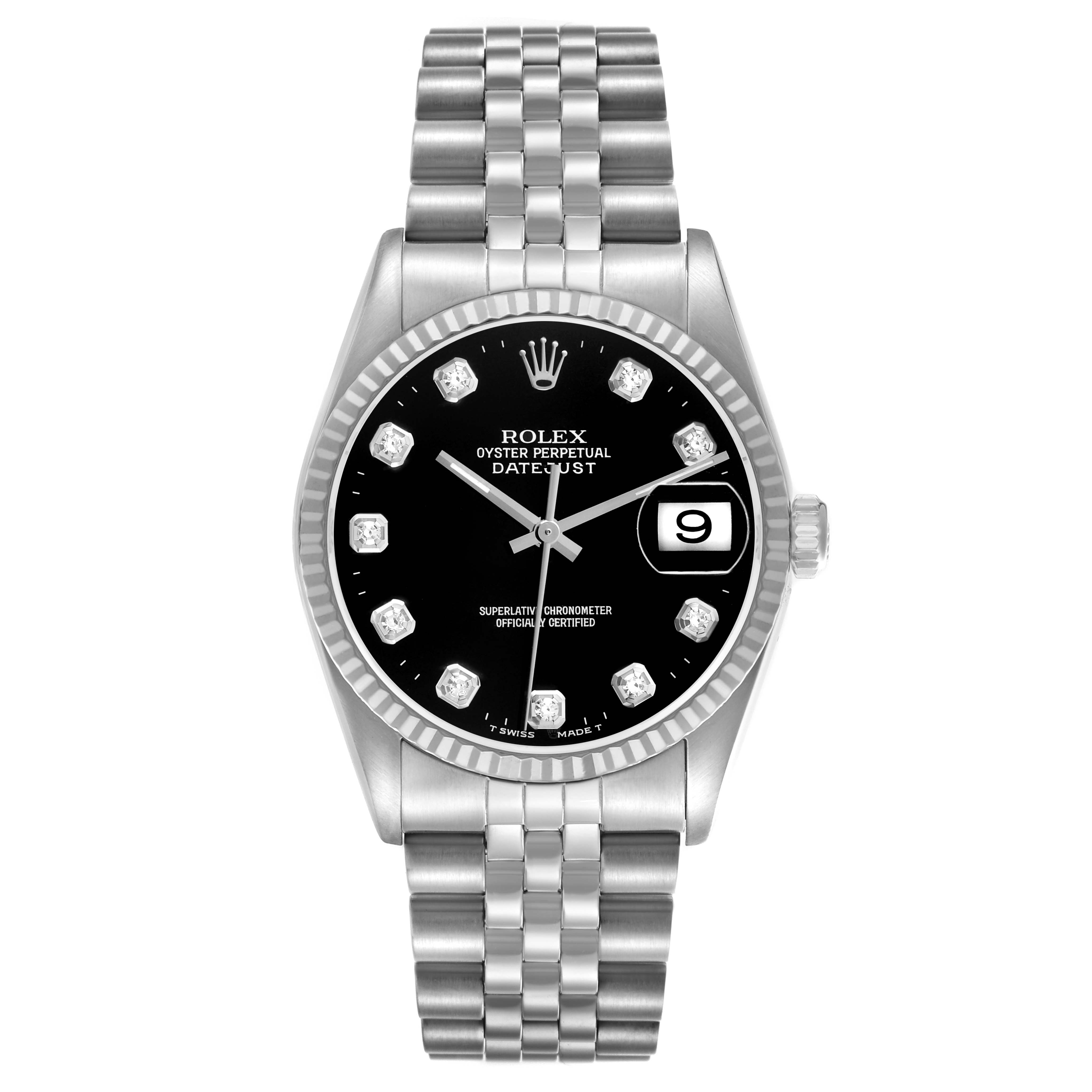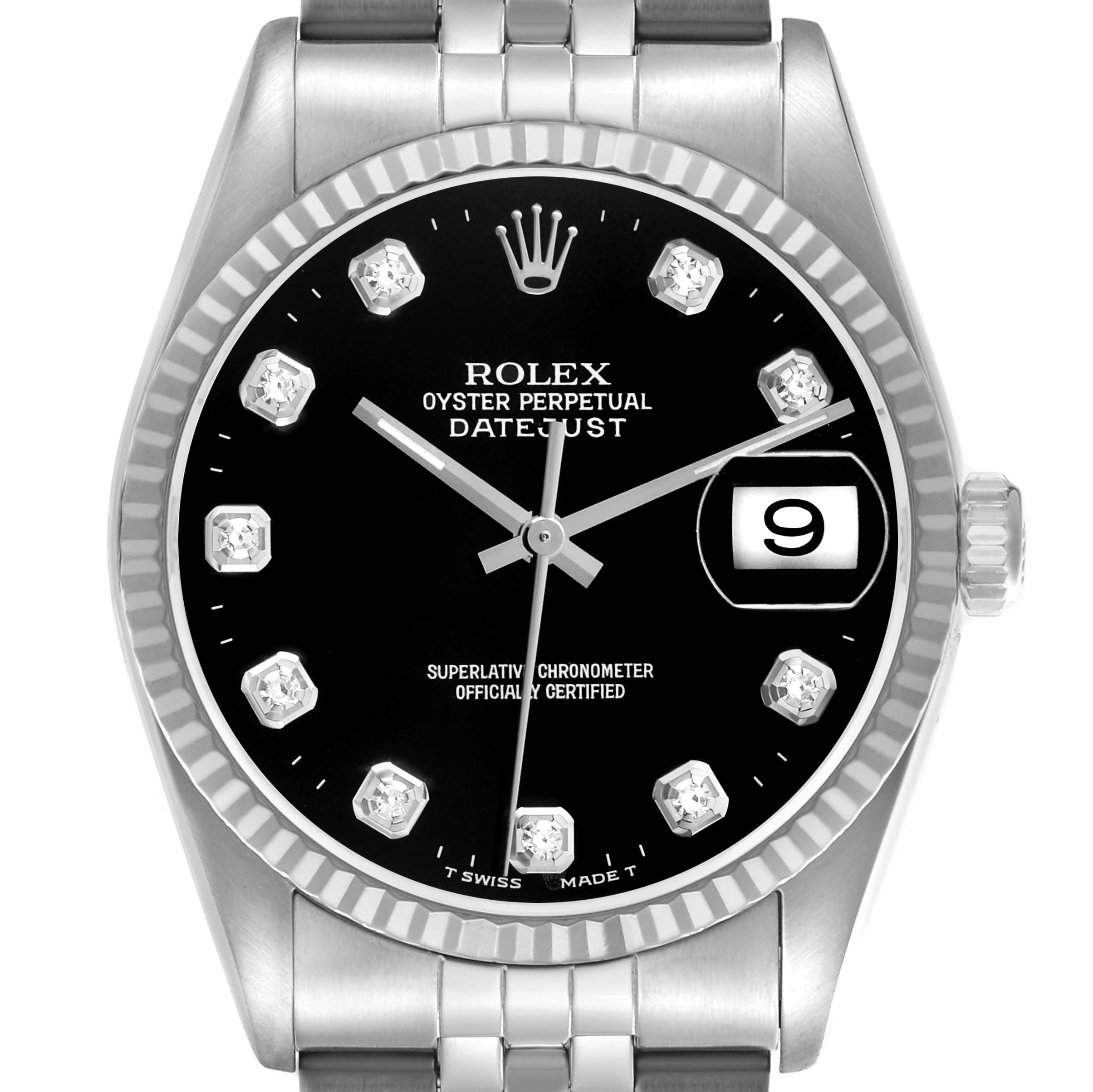 Rolex Datejust Black Diamond Dial Steel White Gold Mens Watch 16234. Officially certified chronometer automatic self-winding movement. Stainless steel oyster case 36.0 mm in diameter. Rolex logo on the crown. 18K white gold fluted bezel. Scratch resistant sapphire crystal with a cyclops magnifier. Black dial with original Rolex factory diamond hour markers and white gold baton hands. Date calendar at the 3 o'clock aperture. Stainless steel jubilee bracelet with a fold over clasp. Fits a 7 3/4" wrist.