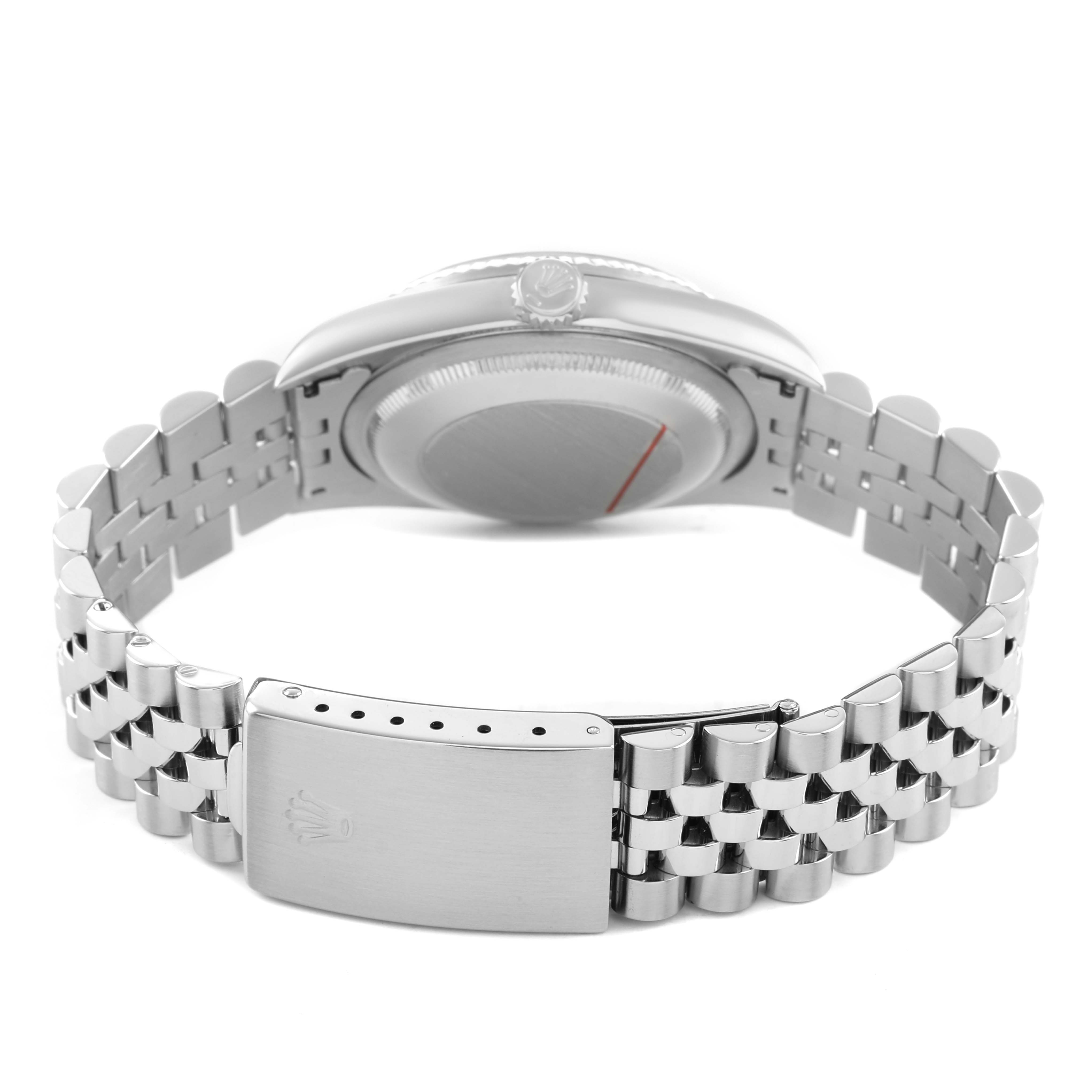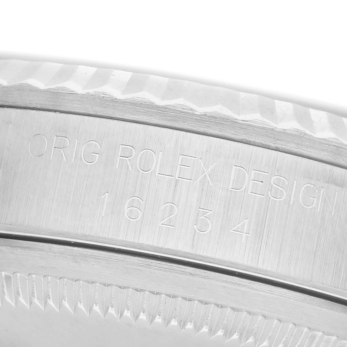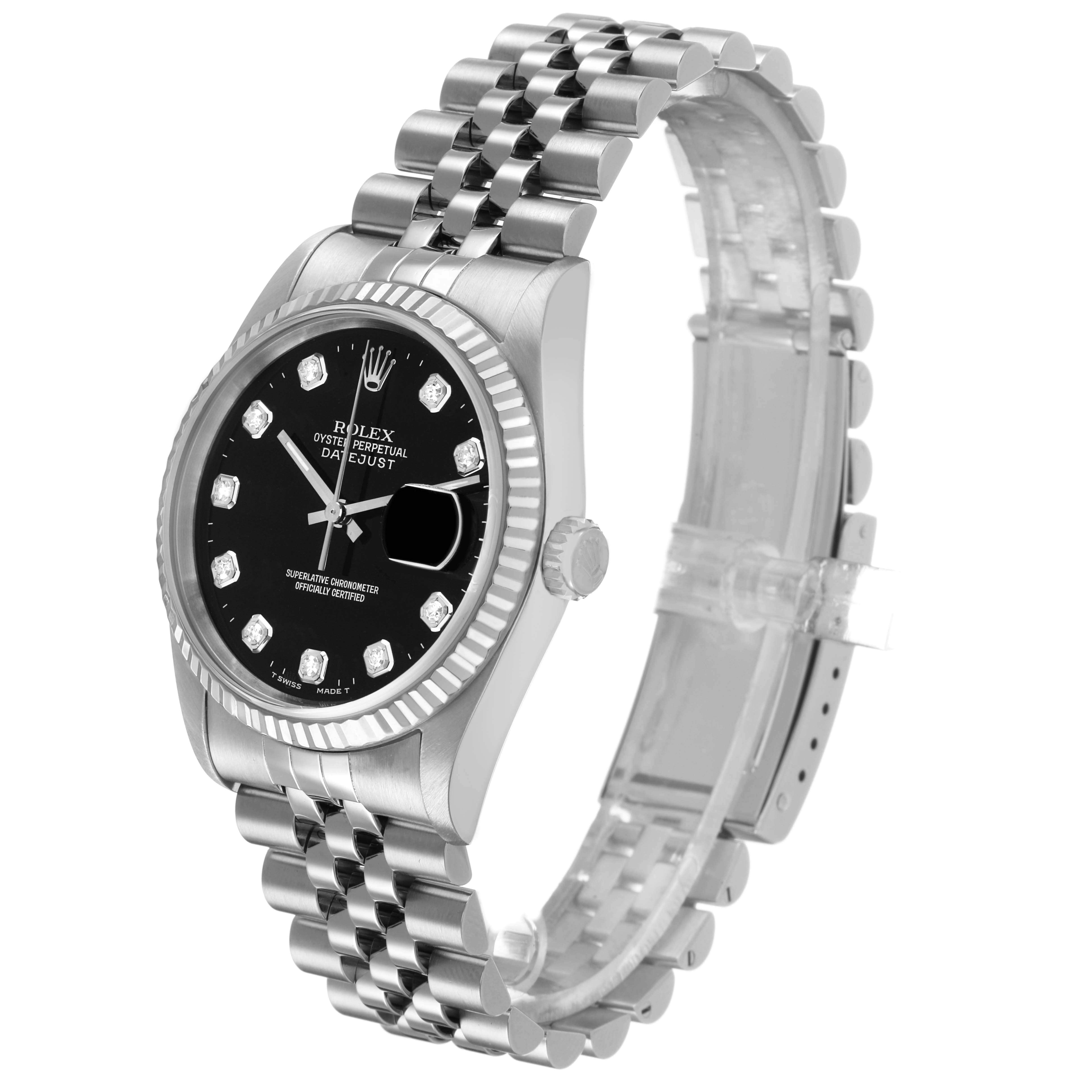 Rolex Datejust Black Diamond Dial Steel White Gold Mens Watch 16234. Officially certified chronometer automatic self-winding movement. Stainless steel oyster case 36.0 mm in diameter. Rolex logo on the crown. 18K white gold fluted bezel. Scratch resistant sapphire crystal with a cyclops magnifier. Black dial with original Rolex factory diamond hour markers and white gold baton hands. Date calendar at the 3 o'clock aperture. Stainless steel jubilee bracelet with a fold over clasp. Fits a 7 3/4" wrist.