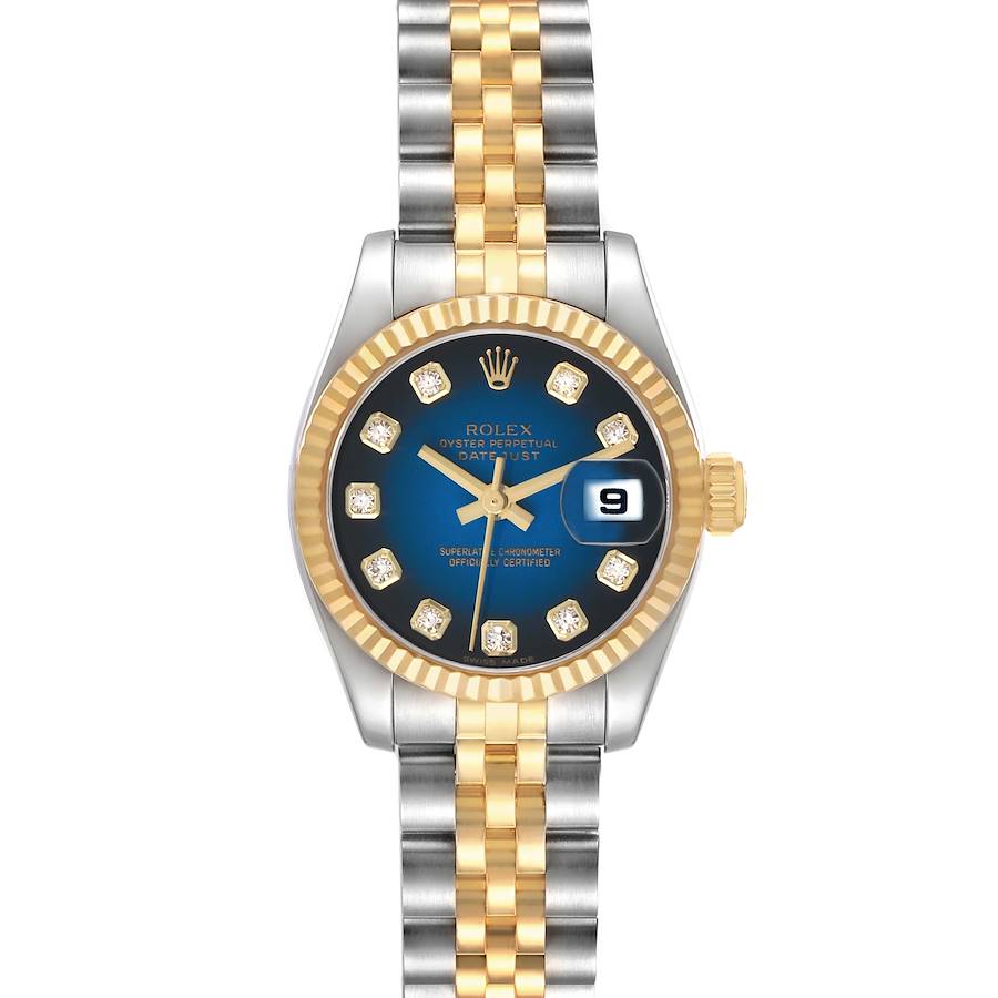 Rolex Datejust Blue Diamond Dial Steel Yellow Gold Ladies Watch 179173 Card. Officially certified chronometer automatic self-winding movement. Stainless steel oyster case 26 mm in diameter. Rolex logo on the 18K yellow gold crown. 18k yellow gold fluted bezel. Scratch resistant sapphire crystal with a cyclops magnifier. Blue vignette dial with original Rolex factory diamond hour markers and yellow gold baton hands. Date calendar at the 3 o'clock aperture. Stainless steel and 18k yellow gold jubilee bracelet with a hidden folding clasp. Fits a 6 1/4" wrist.