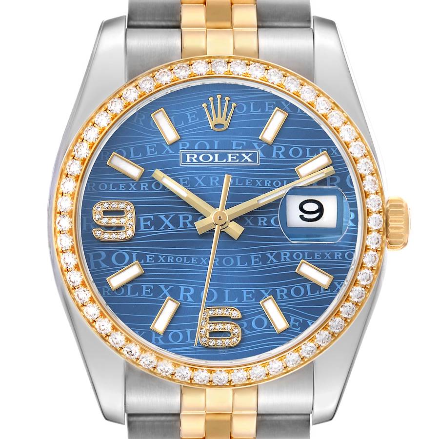 Rolex Datejust Blue Wave Dial Steel Yellow Gold Diamond Men's Watch 116243. Officially certified chronometer automatic self-winding movement. Stainless steel case 36.0 mm in diameter. Rolex logo on an 18k yellow gold crown. 18k yellow gold original Rolex factory diamond bezel. Scratch resistant sapphire crystal with cyclops magnifier. Blue wave dial with yellow gold diamond incrusted Arabic numeral hour markers at 6 and 9. Date window at 3 o'clock aperture. Stainless steel and 18k yellow gold jubilee bracelet with hidden clasp. Fits 7" wrist.