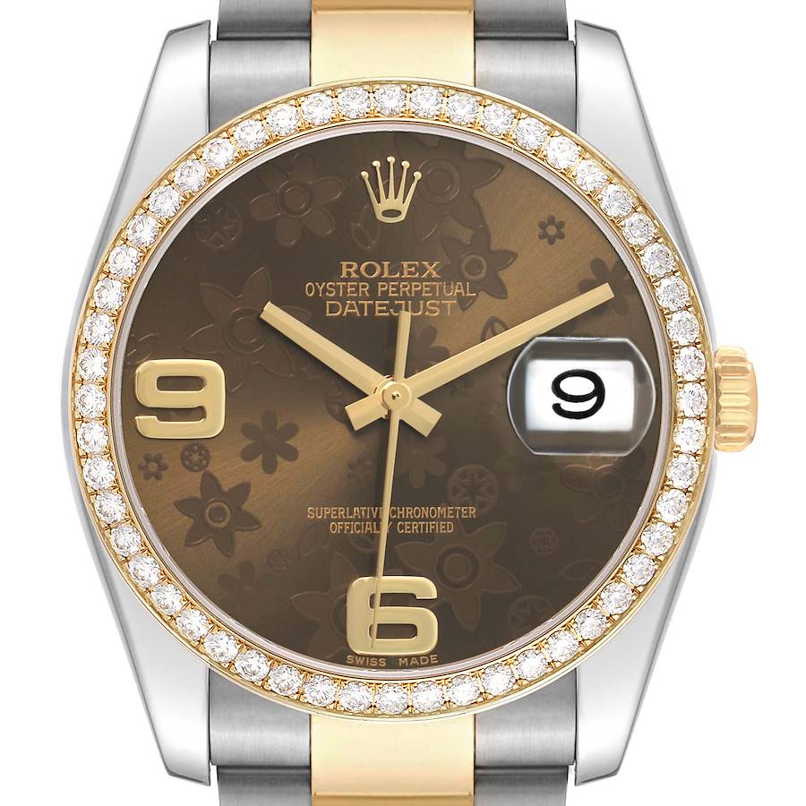 Rolex Datejust Brown Floral Dial Steel Yellow Gold Diamond Men's Watch 116243. Officially certified chronometer automatic self-winding movement. Stainless steel case 36.0 mm in diameter. Rolex logo on an 18k yellow gold crown. 18k yellow gold original Rolex factory diamond bezel. Scratch resistant sapphire crystal with cyclops magnifier. Brown floral motif dial with yellow gold Arabic numeral hour markers at 6 and 9. Date window at 3 o'clock aperture. Stainless steel and 18k yellow gold jubilee bracelet with hidden clasp. Fits 7.5" wrist.