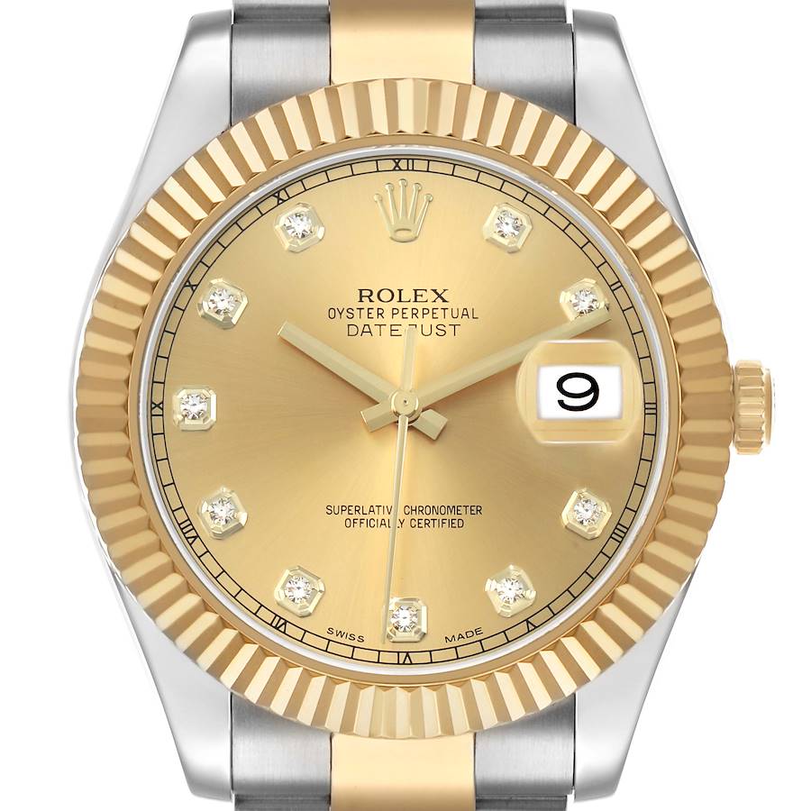 Rolex Datejust II 41 Champagne Diamond Dial Steel Yellow Gold Mens Watch 116333. Officially certified chronometer self-winding movement. Stainless steel and 18K yellow gold oyster case 41.0 mm in diameter. Rolex logo on the 18K yellow gold crown. 18K yellow gold fluted bezel. Scratch resistant sapphire crystal with a cyclops magnifier. Champagne dial with original Rolex factory diamond hour markers and yellow gold baton hands. Date calendar at the 3 o'clock aperture. Stainless steel and 18K yellow gold oyster bracelet with an oysterlock clasp. Fits a 7 3/4" wrist.