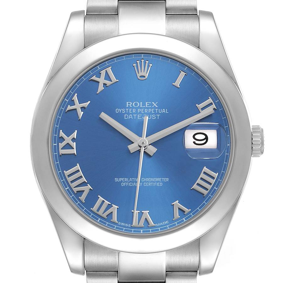 Rolex Datejust II 41 Steel Blue Roman Dial Mens Watch 116300 Card. Officially certified chronometer automatic self-winding movement. Stainless steel case 41.0 mm in diameter. Rolex logo on the crown. Stainless steel smooth bezel. Scratch resistant sapphire crystal with a cyclops magnifier. Blue dial with baton hands and raised Roman numeral hour markers. Outer minute track. Date calendar at the 3 o'clock aperture. Stainless steel oyster bracelet with an Oysterlock clasp. Fits a 7 1/2" wrist.