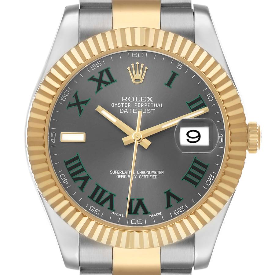 Rolex Datejust II 41 Wimbledon Dial Steel Yellow Gold Mens Watch 116333. Officially certified chronometer automatic self-winding movement. Stainless steel and 18K yellow gold oyster case 41.0 mm in diameter. Rolex logo on the crown. 18K yellow gold fluted bezel. Scratch-resistant sapphire crystal with a cyclops magnifier. Wimbledon grey dial with green Roman numeral hour markers and luminescent yellow gold baton hands. Date calendar at the 3 o'clock aperture. Stainless steel and 18K yellow gold oyster bracelet with an oysterlock clasp. Fits a 7 1/4" wrist.