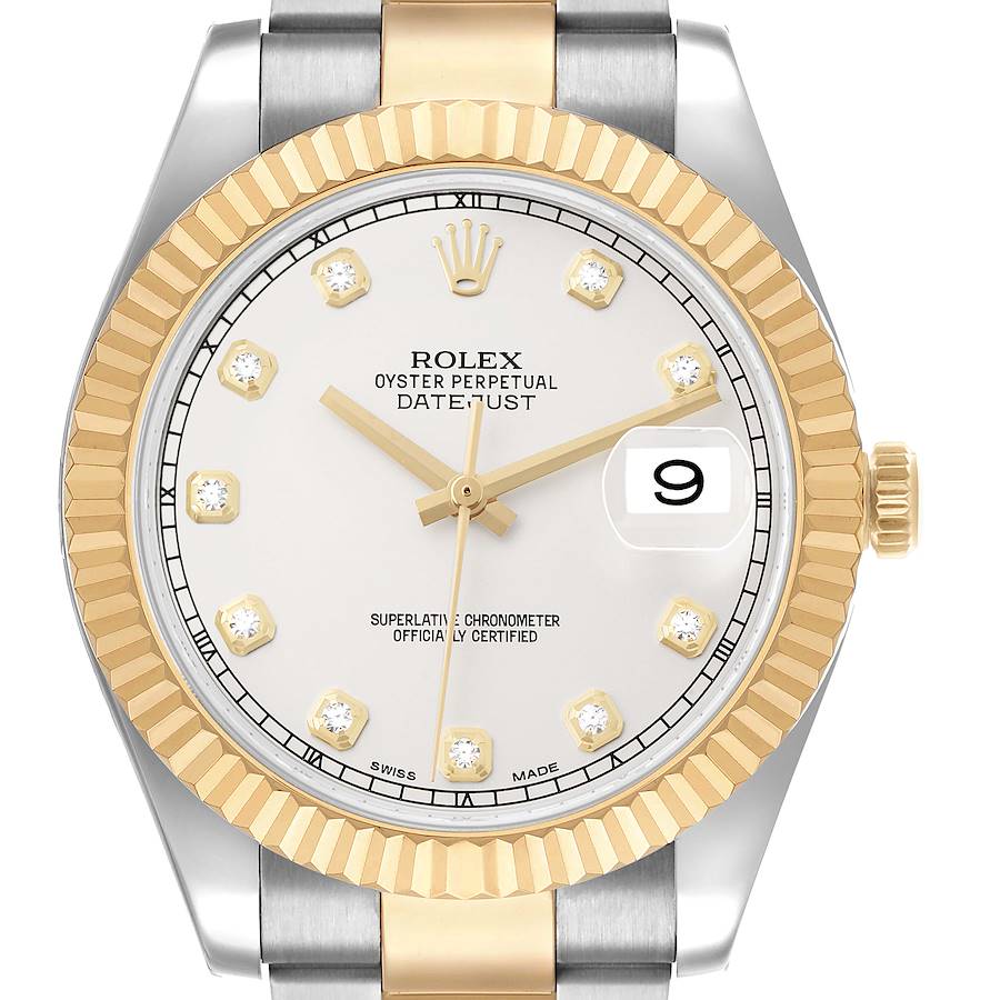 Rolex Datejust II 41 Yellow Gold Silver Diamond Dial Mens Watch 116333. Officially certified chronometer self-winding movement. Stainless steel and 18K yellow gold oyster case 41.0 mm in diameter. Rolex logo on the 18k yellow gold crown. 18K yellow gold fluted bezel. Scratch resistant sapphire crystal with a cyclops magnifier. Silver dial with original Rolex factory diamond hour markers and yellow gold baton hands. Date calendar at the 3 o'clock aperture. Stainless steel and 18K yellow gold oyster bracelet with an oysterlock clasp. Fits a 7.5" wrist.