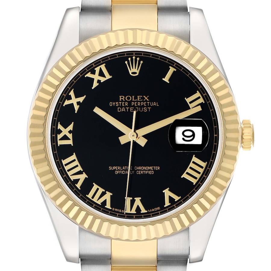 Rolex Datejust II Steel Yellow Gold Black Roman Dial Mens Watch 116333. Officially certified chronometer automatic self-winding movement. Stainless steel and 18K yellow gold oyster case 41.0 mm in diameter. Rolex logo on the 18k yellow gold crown. 18K yellow gold fluted bezel. Scratch resistant sapphire crystal with a cyclops magnifier. Black dial with gilt black Roman numeral hour markers and yellow gold baton hands. Date calendar at the 3 o'clock aperture. Minute markers along the outer rim. Stainless steel and 18k yellow gold oyster bracelet with an oysterlock clasp. Fits a 7 3/4" wrist.