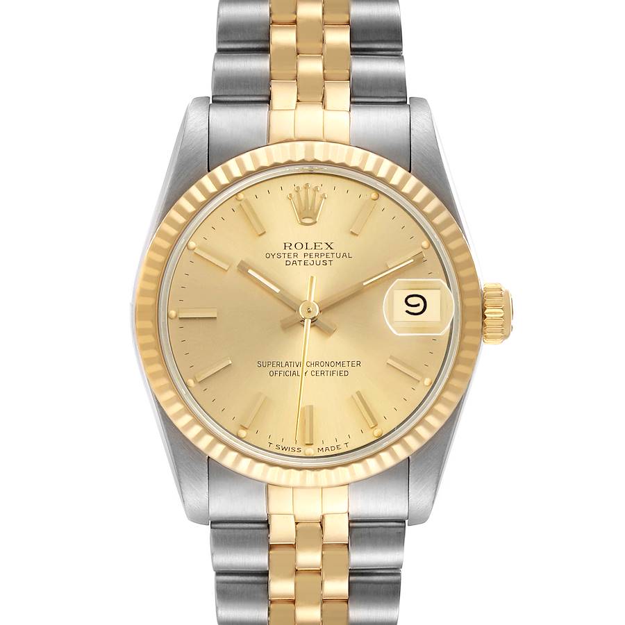 Rolex Datejust Midsize 31 Champagne Dial Steel Yellow Gold Ladies Watch 68273. Officially certified chronometer automatic self-winding movement. Stainless steel oyster case 31.0 mm in diameter. Rolex logo on the 18K yellow gold crown. 18k yellow gold fluted bezel. Scratch resistant sapphire crystal with a cyclops magnifier. Champagne dial yellow gold baton hour markers and hands. Outer stick minute track. Date calendar at the 3 o'clock aperture. Stainless steel and 18k yellow gold jubilee bracelet with a fold-over clasp. Fits a 6 3/4" wrist.