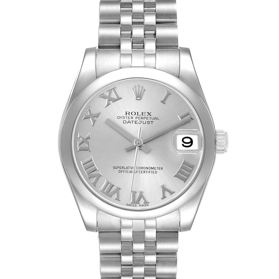 Rolex Datejust Midsize 31 Grey Roman Dial Steel Ladies Watch 178240 Box Papers. Officially certified chronometer automatic self-winding movement. Stainless steel oyster case 31.0 mm in diameter. Rolex logo on the crown. Stainless steel smooth round bezel. Scratch resistant sapphire crystal with a cyclops magnifier. Grey dial with raised white gold Roman numeral hour markers and white gold baton hands. Date calendar window at 3 o'clock. Stainless steel jubilee bracelet with a hidden clasp. Fits a 6.5" wrist.