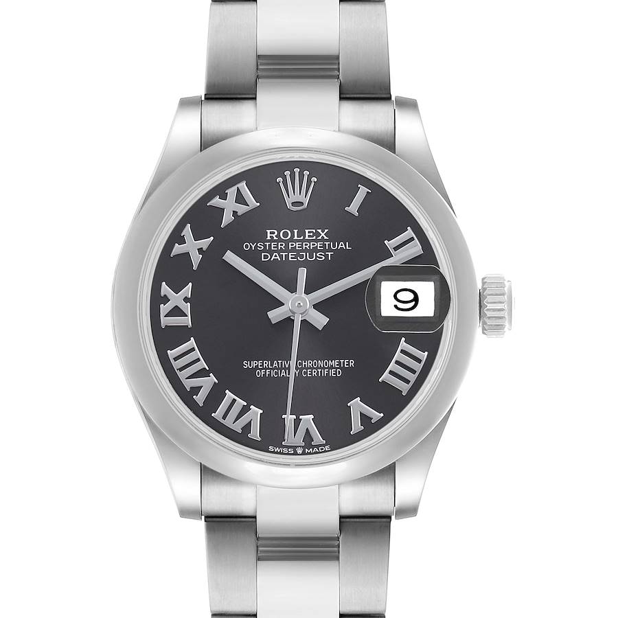 Rolex Datejust Midsize 31 Steel Grey Dial Ladies Watch 278240. Officially certified chronometer self-winding movement. Stainless steel oyster case 31.0 mm in diameter. Rolex logo on a crown. Stainless steel smooth bezel. Scratch resistant sapphire crystal. Grey dial with raised Roman numeral hour markers. Date calendar window at 3 o'clock. Stainless steel oyster bracelet with an Oysterlock clasp. Fits a 7" wrist.