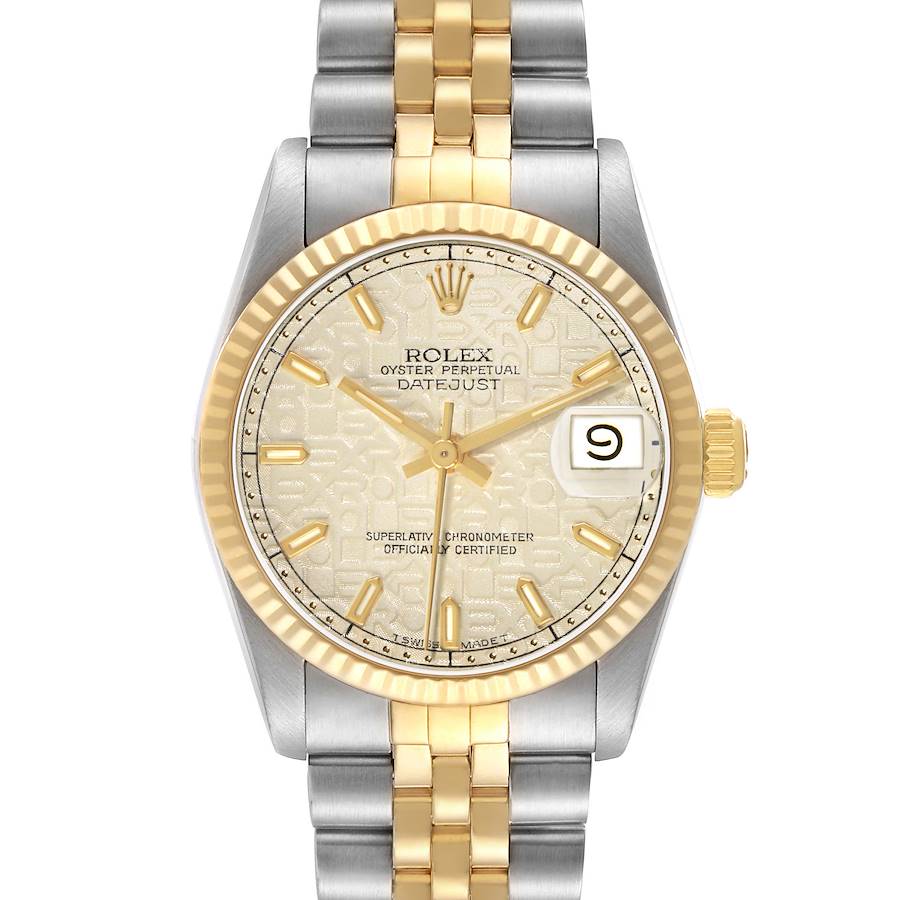 Rolex Datejust Midsize 31 Steel Yellow Gold Ivory Dial Ladies Watch 68273. Officially certified chronometer self-winding movement. Stainless steel oyster case 31 mm in diameter. Rolex logo on a 18K yellow gold crown. 18k yellow gold fluted bezel. Scratch resistant sapphire crystal with cyclops magnifier. Ivory jubilee anniversary dial with raised baton hour numerals. Date calendar at 3 o'clock aperture. Stainless steel and 18k yellow gold Jubilee bracelet with fold over clasp. Fits a 6 3/4" wrist.