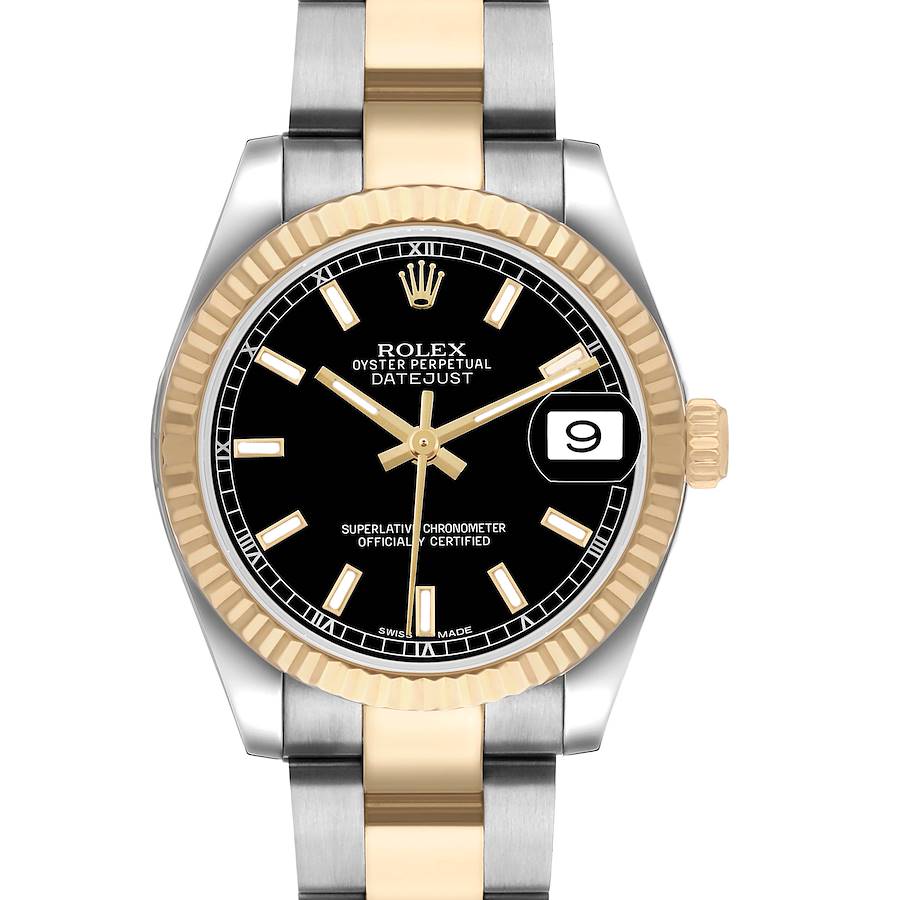 Rolex Datejust Midsize 31 Steel Yellow Gold Ladies Watch 178273. Officially certified chronometer automatic self-winding movement. Stainless steel oyster case 31.0 mm in diameter. Rolex logo on an 18K yellow gold crown. 18k yellow gold fluted bezel. Scratch resistant sapphire crystal with cyclops magnifier. Black dial with applied luminous baton hour markers. Date calendar at 3 o'clock aperture. Stainless steel and 18k yellow gold Oyster bracelet with Oyster-lock clasp. Fits a 7" wrist.