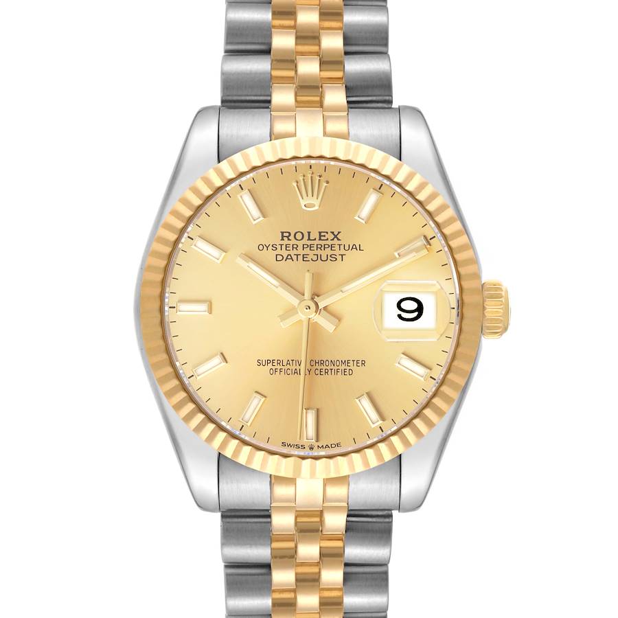Rolex Datejust Midsize 31 Steel Yellow Gold Ladies Watch 178273 Card. Officially certified chronometer self-winding movement. Stainless steel oyster case 31.0 mm in diameter. Rolex logo on 18K yellow gold crown. 18k yellow gold fluted bezel. Scratch resistant sapphire crystal with cyclops magnifier. Champagne dial with luminous baton hour markers. Date calendar at 3 o'clock aperture. Stainless steel and 18k yellow gold jubilee bracelet with a hidden deplyant clasp. Fits 7 3/4" wrist.