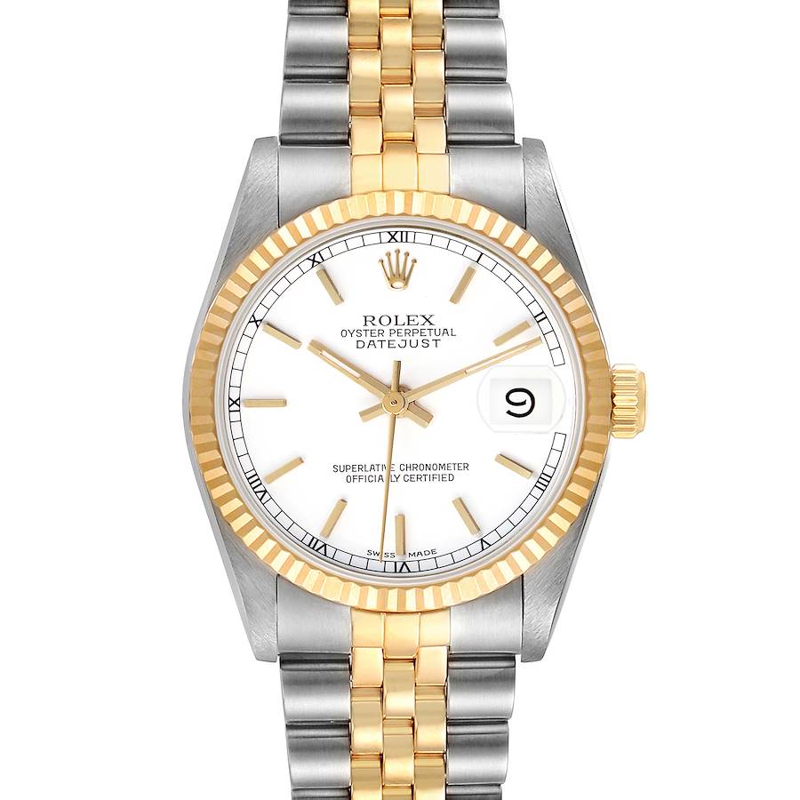 Rolex Datejust Midsize 31 White Dial Steel Yellow Gold Ladies Watch 68273. Officially certified chronometer automatic self-winding movement. Stainless steel oyster case 31.0 mm in diameter. Rolex logo on the 18K yellow gold crown. 18k yellow gold fluted bezel. Scratch resistant sapphire crystal with a cyclops magnifier. White dial with yellow gold baton hour markers and hands. Outer stick minute track with roman numerals. Date calendar at the 3 o'clock aperture. Stainless steel and 18k yellow gold jubilee bracelet with a fold-over clasp. Fits a 7" wrist.