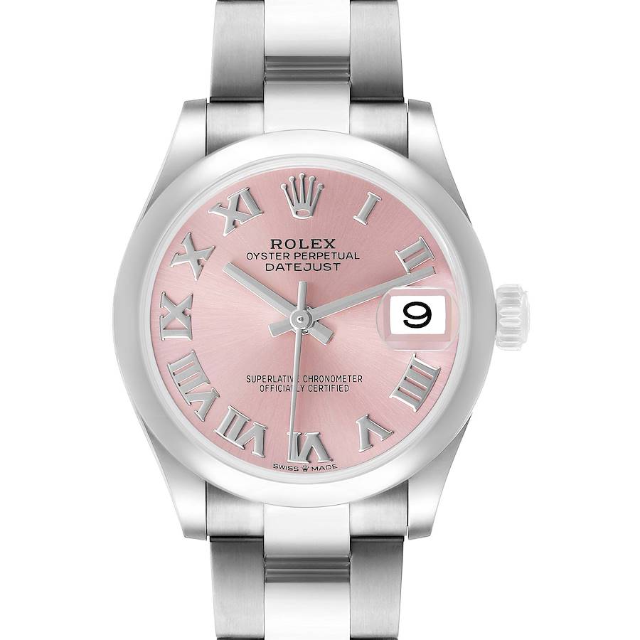 Rolex Datejust Midsize Steel Pink Roman Dial Ladies Watch 278240. Officially certified chronometer self-winding movement. Stainless steel oyster case 31.0 mm in diameter. Rolex logo on a crown. Stainless steel smooth bezel. Scratch resistant sapphire crystal. Pink dial with raised roman numeral hour markers. Date calendar window at 3 o'clock. Stainless steel oyster bracelet with oysterlock clasp. Fits a 6 1/2" wrist.