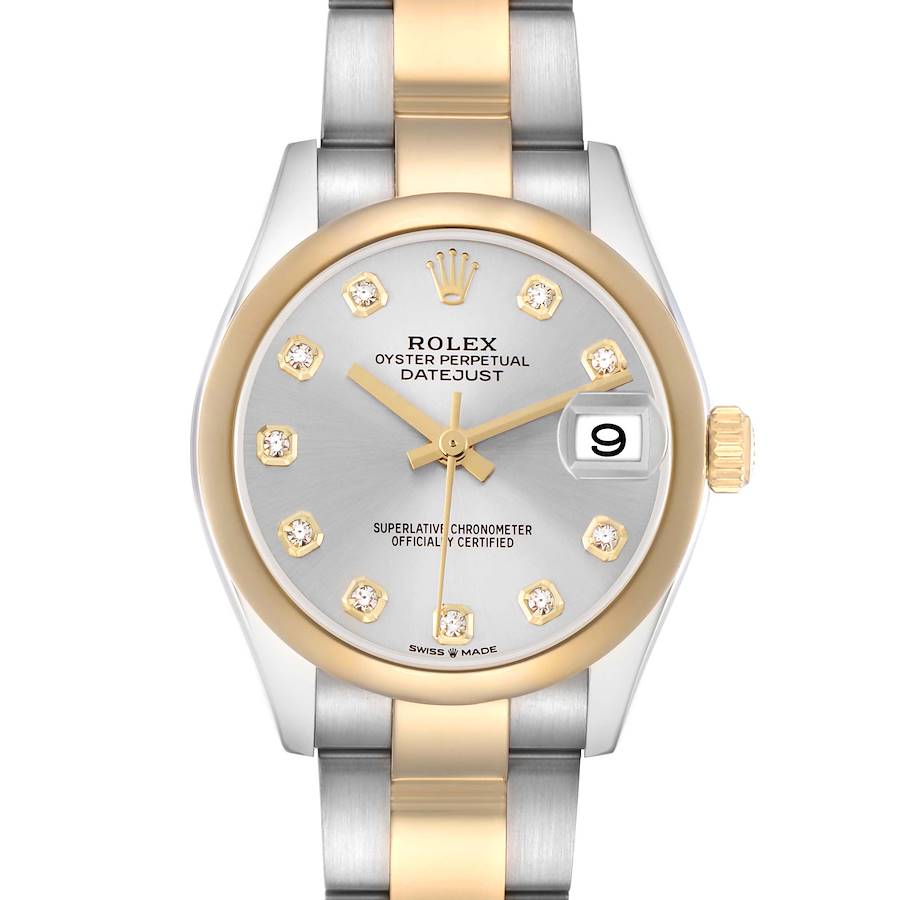 Rolex Datejust Midsize Steel Yellow Gold Diamond Ladies Watch 278243 Box Card. Officially certified chronometer automatic self-winding movement. Stainless steel and 18k yellow gold oyster case 31.0 mm in diameter. Rolex logo on the 18k yellow gold crown. 18k yellow gold smooth domed bezel. Scratch resistant sapphire crystal with a cyclops magnifier. Silver dial with original Rolex factory diamond hour markers and yellow gold baton hands. Date calendar at the 3 o'clock aperture. Stainless steel and 18k yellow gold oyster bracelet with an oysterlock clasp. Fits a 6 3/4" wrist.