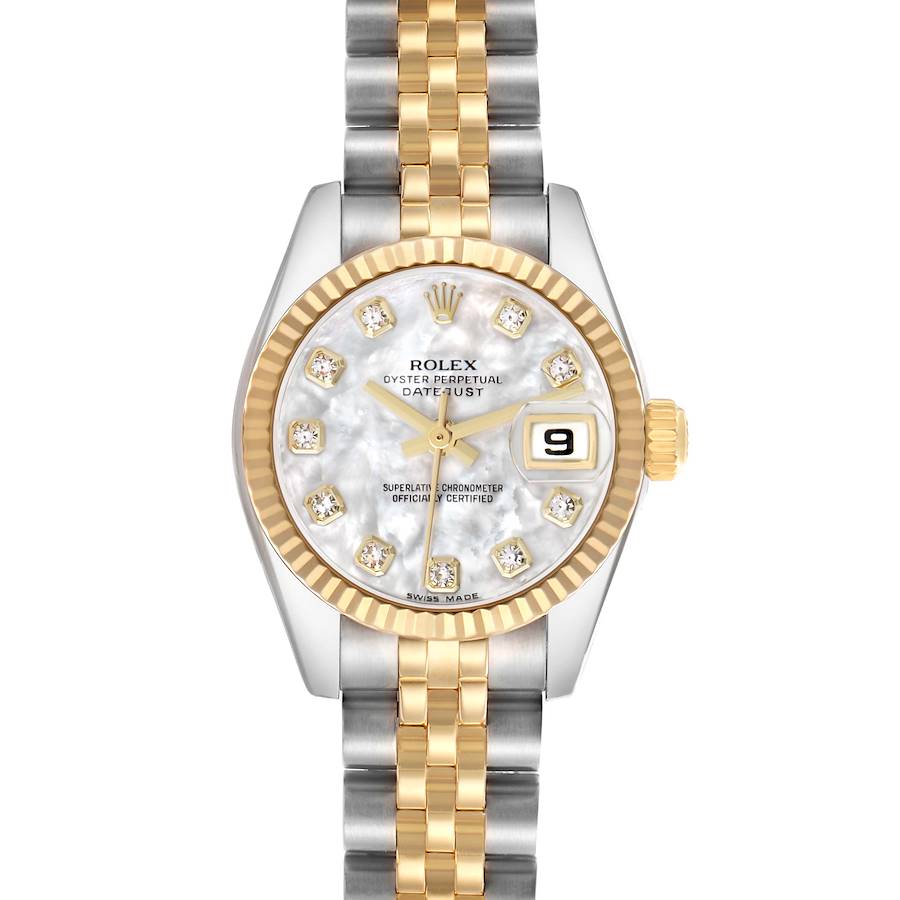 Rolex Datejust MOP Diamond Dial Steel Yellow Gold Ladies Watch 179173 Papers. Officially certified chronometer automatic self-winding movement. Stainless steel oyster case 26.0 mm in diameter. Rolex logo on the 18K yellow gold crown. 18k yellow gold fluted bezel. Scratch resistant sapphire crystal with cyclops magnifier. Mother of Pearl dial with original Rolex factory diamond hour markers and yellow gold baton hands. Date calendar at the 3 o'clock aperture. Stainless steel and 18k yellow gold jubilee bracelet with a hidden clasp. Fits a 6 1/2" wrist.