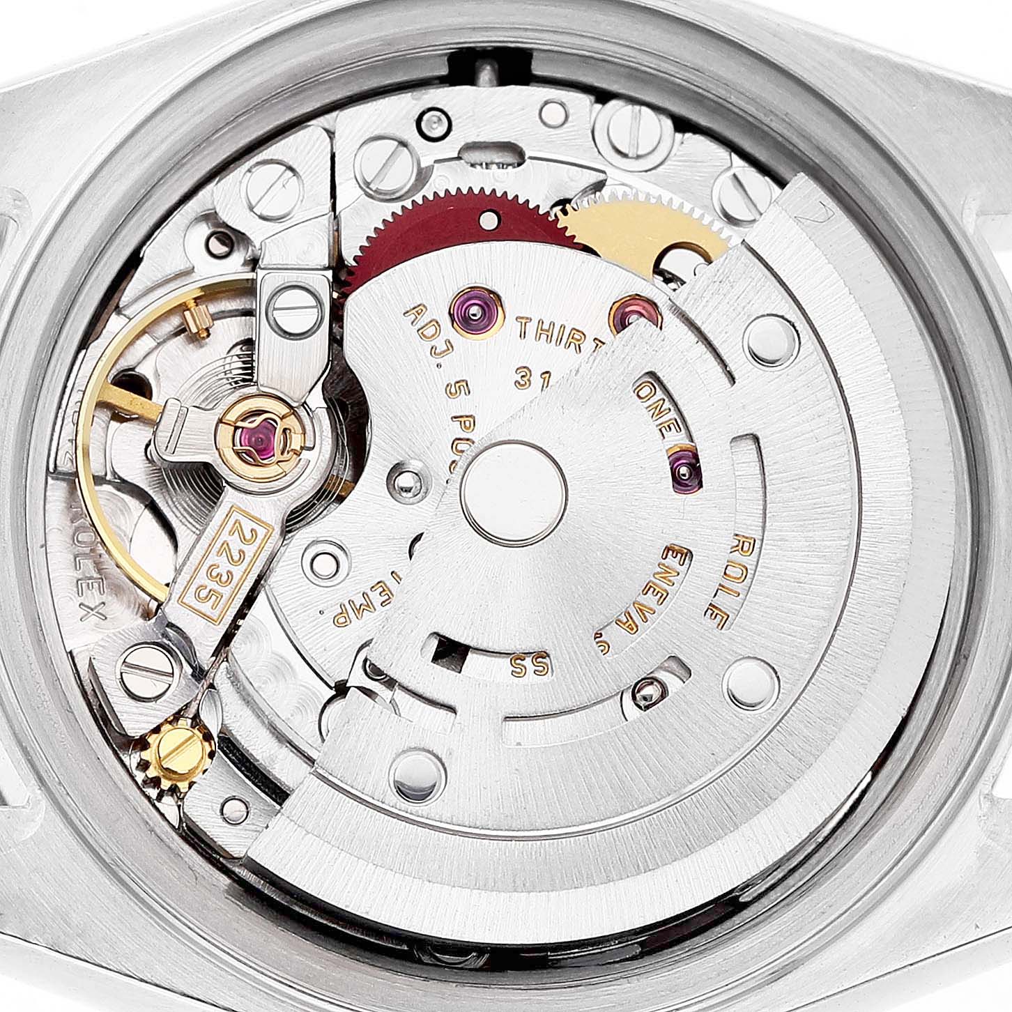| Dial: | Mother-of-pearl dial with baton hands and raised Arabic numeral hour markers. Date calendar at the 3 o'clock aperture. |